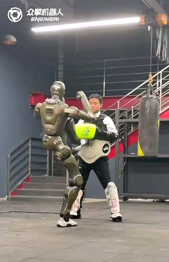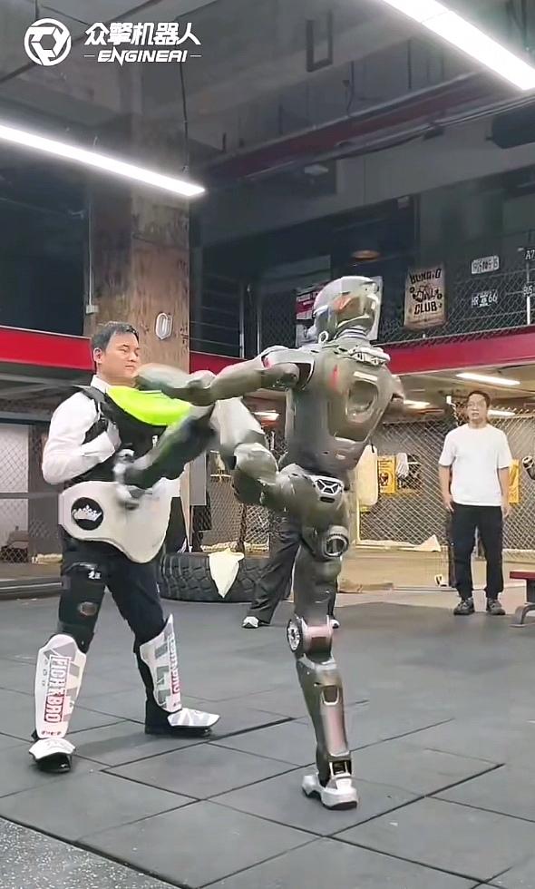 众擎机器人T800,一脚把自家CEO 踹翻在地。这一脚比75公斤的人类重的多,机器人关节是电机相当于锁死关节,用脚冲撞。跟咏春把全身力气集中在手上是一样的,人的关节弯一下会卸力,机器人就是个铁疙瘩硬撞。而且这东西没表情没眼神,攻击非常突然和快,它这一脚太突然了。这才一年的时间从春晚的机器人到现在的小鹏、众擎、宇树机器人进化这么快不敢想想再有五年会怎么样我国的科技进步太快了!众擎人形机器人