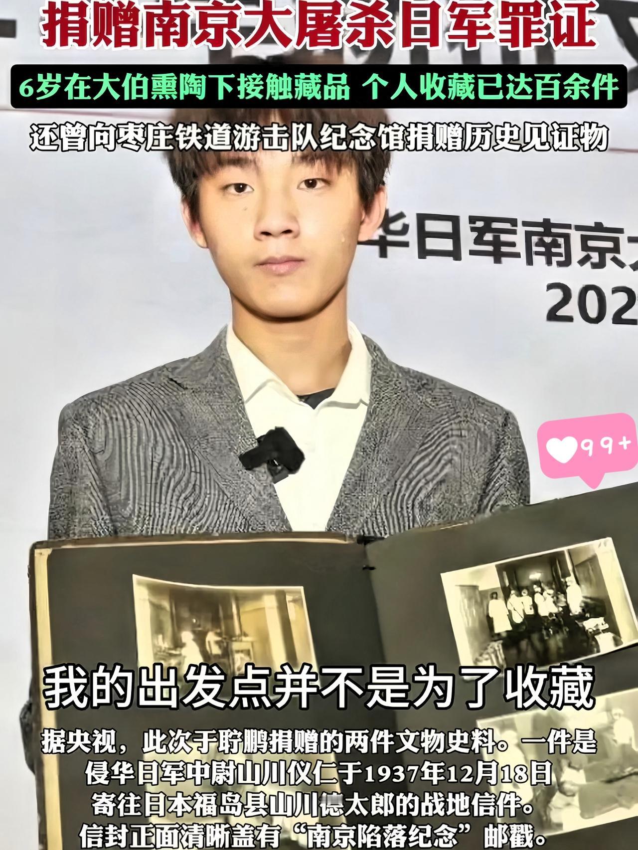这下好了,全网都知道了! 江苏徐州15岁高中生于聍鹏,太让人佩服了! 别的孩子爱刷视频、打游戏,他却钟情历史收藏。网上发现两件日军侵华史料罪证后,他用自己的零花钱买下,转头就捐给了徐州抗日战争纪念馆。 “放在纪念馆,能让更多人看到铁证”——朴实的话里,是刻在骨子里的爱国心。 年轻一代没忘历史,这份家国情怀,值得全网点赞!你怎么看?