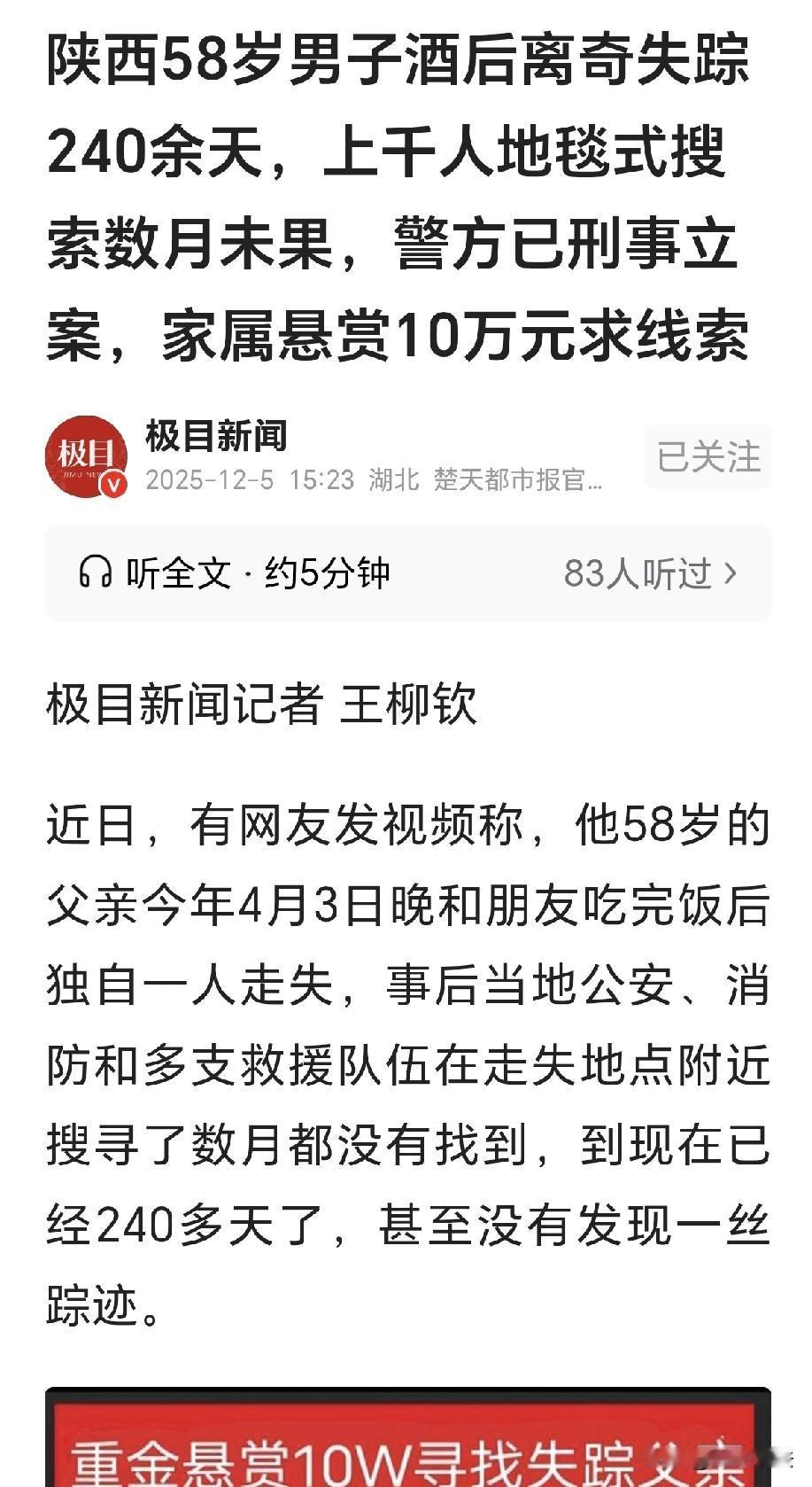 陕西延安,一58岁男子和人喝酒,晚上10:50,男子在餐馆门口消失,凌晨2点,儿子拨通了男子电话,男子回答:“没路了!”之后电话关机,儿子无奈报警,消防警方救援队多方搜救,搜救犬,热成像无人机全都用上,可男子消失,活不见人,死不见尸,240过去,男子依旧毫无音讯,家属急了,悬赏10万,寻找线索,失踪原因扑朔迷离! 赵鹏万分焦急,他已经240天没有见过父亲,父亲到底去了哪里,他和母亲日夜担忧焦虑。 他不相信,父亲就能凭空消失,他更不知道父亲到底遇见了什么事情。 原来,父亲赵永刚今年58岁,他的工作是一名开校车的司机。 父亲为人热情,他开朗外向,平时待人接物,十分的热心积极。 因此一来,他除了作为一名校车司机,接送孩子,他家住在延安宝塔区,他乐于助人,还担任着小区的业委会主任之职。 今年4月3日,晚上7点钟左右,赵永刚和几位同事以及物业经理,他们相约,一起到一家餐馆吃饭。 临走之前,赵永刚妻子特意叮咛,要他不要喝酒,吃完饭就赶紧回来休息。 赵永刚满口的答应,随后就和朋友们去了餐馆,可到了餐厅,妻子的话就忘到了脑后。 几个人边吃边喝,他们聊的十分的高兴,不知不觉,半斤酒就喝到了肚里。 可赵永刚酒量不错,他甚至能喝到一斤白酒,旁人对他都甘拜下风,半斤酒对他来说,根本就算不上喝多。 几个人边吃边聊,在餐馆一直聊到了晚上10:50分左右。 几个人这才恋恋不舍,结完账后陆续走到了餐馆门口,几人握手道别,一位同事本想驾车带着赵永刚一起走。 可同事着急,要去趟厕所,要他稍安勿躁,就在餐厅门口稍等片刻。 谁知同事回来之后,就这上一趟厕所的功夫,赵永刚已经消失在了餐馆门口。 同事连忙四处寻找,喊破了喉咙,依旧不见他的踪迹。 同事有点担心,怕他喝酒后犯了迷糊,赶忙通知了他的家人,要他们过来寻找。 赵鹏收到电话,急急忙忙叫了几位亲朋好友,他们立刻赶往餐馆附近,他们急匆匆分头寻找。 可是找了一圈下来,并没有看到赵永刚的行踪,赵鹏连续给父亲拨打电话, 可赵永刚的电话,始终显示无人接听。 赵鹏焦急万分,他怕父亲喝酒后找不到路,可是他又非常奇怪,听吃饭的人说,父亲不过就喝了半斤白酒。 就父亲的酒量来说,半斤酒不可能会醉的迷糊,可是一起吃饭的人又说,赵永刚吃饭时抽了5支烟之多。 这一点倒是颇为奇怪,因为赵永刚从不抽烟。 赵鹏越想越怕,不停点的拨打父亲的电话,到了凌晨2:01分左右,赵永刚的电话接通了。 赵永刚在电话里说: 往回走了……没路了……,之后挂断电话,就再无人接听。 到了3点左右,赵永刚电话彻底关机,之后再也联系不上,直到凌晨5点,赵鹏无奈报警。 警方调出监控,发现赵永刚离开餐馆后,走了3公里左右,到了山脚下的一所学校。 之后他又跌跌撞撞,脚底下深一脚浅一脚,又走了2公里左右,到了宝塔区第4中学附近。 然后他又继续行走,绕了一大圈后,重新回到了山脚下。 这一路下来,他步行了有8公里路程。 警方立刻立案侦查,并成立了专案组,警方,消防,救援队,红十字会等多方支援,对赵永刚失踪地点进行了全方位的搜救。 热成像无人机在上空搜查,搜救犬也在附近的山上到处找寻。 各个救援队竭尽全力,搜救人员高达千人之上。 可是从4月份开始,一直到8月份,赵永刚还是没有任何的音讯。 一个大活人就这么凭空消失,赵永刚家人无论如何都不能够相信。 他们活要见人,死要见尸,赵鹏在网上购买了寻人工具。 他连山上的涵洞都一一探访,可是依旧没有父亲的踪迹。 父亲就这么失踪了,赵鹏怎么也不能接受,难道说父亲出了意外不成? 可即便有了意外,这么全方位的搜寻,就连一只鞋子也没有看到。 赵鹏在脑海里做出了各种的推测,他就不明白了,父亲到底是遭遇到了什么? 在他看来,父亲赵永刚在失踪之前,并没有表现出来有什么异常,可事情已经发生了,赵鹏不得不面对现实。 如今的赵鹏,已经无心工作,他每天都在山上,漫无目的的到处搜寻。 这场救援有数千人一起参与,甚至动用了各种的专业工具。 如今赵永刚失踪240天,警方始终没有放弃,仍在坚持进一步的侦查办理。 赵鹏在全网发出寻人启事,悬赏10万元寻找着父亲。 他在启示中表示: 凡提供直接有效线索,成功找到父亲,酬金10万,他会当场兑现。 如果有人知道赵鹏父亲的信息,希望能够帮助他找回父亲。 《民法典》第499条规定:悬赏人以公开方式声明对完成特定行为的人支付报酬的,完成该行为的人可以请求其支付。 赵鹏在全网发布悬赏10万元寻找父亲线索的启事,合法有效。 其以公开方式明确声明,提供直接有效线索并成功找到父亲即付酬金10万,意思表示真实具体。 若他人完成指定行为,既提供有效线索促成找到赵永刚,即享有报酬请求权,赵鹏需按承诺兑现10万元酬金。 希望赵鹏能够早日找到父亲。