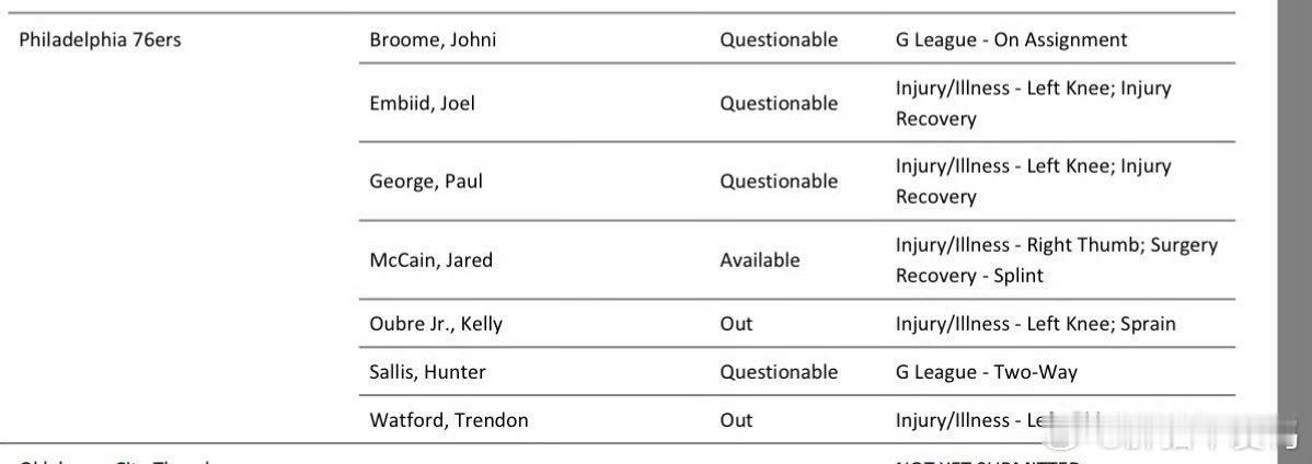 明天湖人对战76人双方的伤病名单来了!湖人这边詹姆斯(右侧坐骨神经痛以及左脚关节炎出战成疑)斯玛特(背部痉挛缺席)!76人这边——恩比德(左膝盖出战成疑)、乔治(左膝出战成疑)、萨利斯(发展联盟)出战成疑、乌布雷(左膝伤势缺席)、沃特福德(左内收肌缺席)麦凯恩(右拇指)可以出战!斯玛特已经连续缺席5场比赛了,湖人现在对他的伤病情况非常谨慎!墙哥本赛季在湖人担任非常重要的角色,也是湖人外线防守的关键人物,希望他早日康复吧!詹姆斯明天出战成疑!在昨天詹姆斯就已经缺席对战凯尔特人的比赛,在他复出以来,湖人两次背靠背他均缺席比赛,如果明天他再缺席,那么距离65场常规赛就会持平!也就是说,他明天再缺席,本赛季将没有机会再缺席了,如果他想竞争本赛季的奖项,接下来65场常规赛,他都必须全部出战!但照现在看来,詹姆斯已经不在乎什么奖项了,好好健康打球才是詹姆斯目前的现状!且看且珍惜,老头已经离退役越来越近了!76人这边恩比德乔治出战成疑,恩比德因为膝盖伤势近期才复出打了两场比赛,而乔治也因为膝盖伤势,打一场歇一场!本赛季76人三巨头才合体过一次,明天打湖人,他们有望迎来赛季第二次合体,上一场合体是打老鹰,三巨头合砍78分并鏖战至双加时最后还是输给了老鹰!乔治跟恩比德在复出后状态仍然低迷!而东契奇将在明天回归球队,照目前看76人伤病名单这么多,湖人明天胜率会更高!湖人健康东契奇洛杉矶湖人费城76人恩比德保罗乔治詹姆斯