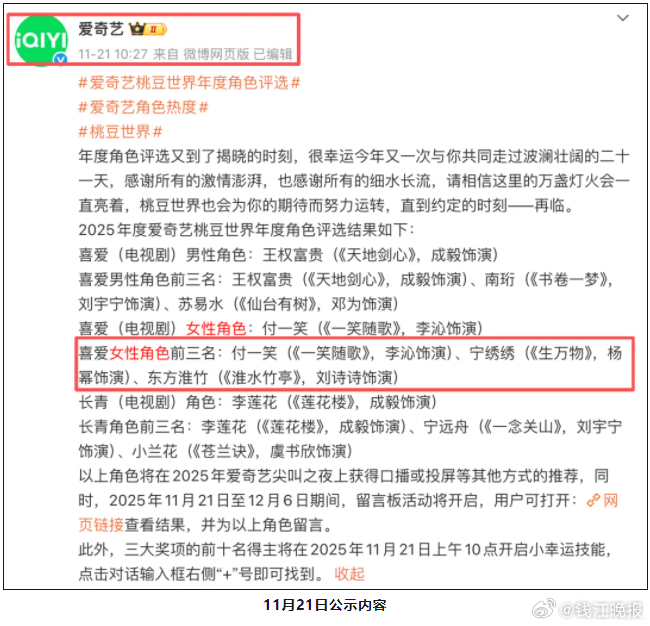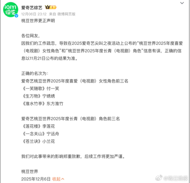 【“年度喜爱女性角色”刘诗诗角色奖项被换成白鹿,#爱奇艺道歉#:因工作疏忽导致信息有误,正确信息以此前公布结果为准】#刘诗诗白鹿 爱奇艺##白鹿尖叫女演员# 12月6日晚,澳门爱奇艺尖叫之夜颁奖礼出现奖项公示结果与现场播报不一致的乌龙事件。#白鹿回应获尖叫女演员# 此前11月21日,平台曾公示“年度喜爱女性角色”投票前三,其中刘诗诗凭借《淮水竹亭》中东方淮竹一角位列第三,但颁奖现场该角色被移出榜单。白鹿凭借《临江仙》李青月空降第二,原亚军杨幂饰演的宁绣绣则降至第三。当晚, 发布更正声明:“各位网友,因我们的工作疏忽,导致在2025爱奇艺尖叫之夜活动上公布的“桃豆世界2025年度喜爱(电视剧)女性角色”和“桃豆世界2025年度长青(电视剧)角色”信息有误,正确的信息以11月21日公布的结果为准。正确的名次为:爱奇艺桃豆世界2025年度喜爱(电视剧)女性角色前三名《一笑随歌》付一笑《生万物》宁绣绣《淮水竹亭》东方淮竹爱奇艺桃豆世界2025年度长青(电视剧)角色前三名《莲花楼》李莲花《一念关山》宁远舟《苍兰诀》小兰花我们对此事带来的影响郑重致歉,后续工作将更加严谨。”(来源:爱奇艺综艺 潇湘晨报综合)