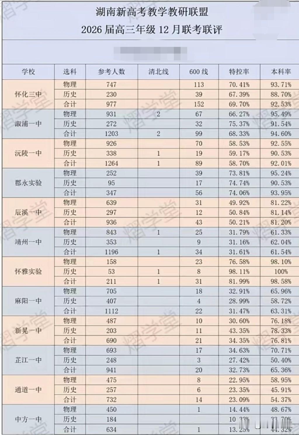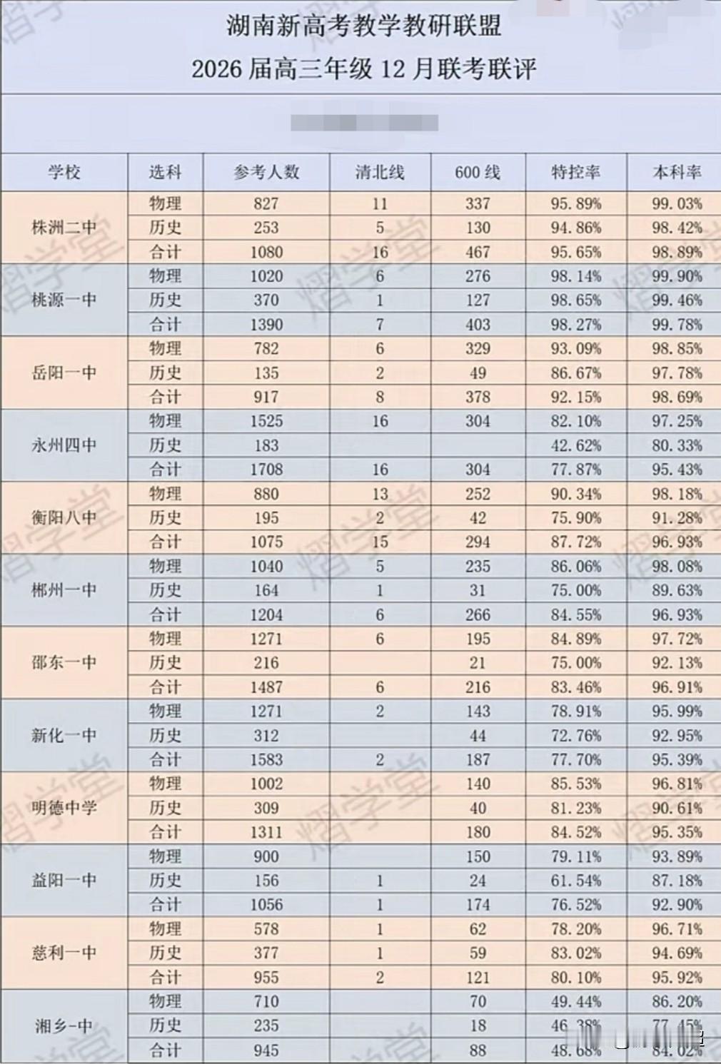 湖南省2026届高三年级12月联考部分学校600分以上人数及上线率情况。 在2026届12月大联考中,株洲二中和桃源一中600分以上人数均达400多人。 从各校整体数据来看,600分以上人数及各项上线率数据与该校2025年高考数据颇为相似。