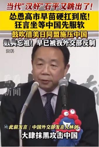 高市早苗疯狂反华,背后竟是两个中国败类在出谋划策?为高市早苗出谋划策的两个中国败类,分别是石平太郎和矢板明夫,二人都靠背叛祖国、抹黑中国讨好日本右翼,成为高市早苗反华路上的关键推手。 说白了,这俩人算是站在了日本右翼的立场上,背叛了自己的祖国,成了高市早苗反华路上的“得力助手”。 先来说说石平太郎,原本是叫石平,四川人,当时去日本留学本是为了深造,结果之后他不仅没有选择回国,反而选择加入了日本的国籍,甚至还改了个日本名。 从那时起,他就和中国渐行渐远,彻底融入了日本社会,站在了日本右翼的一边。 此后,石平太郎的言论常常让人震惊,他不仅攻击中国的政治制度,还时不时抹黑中国的历史和文化。与日本右翼的立场一拍即合,他也就得到了很多右翼势力的支持。 他通过在媒体上的频繁发声,为高市早苗提供了不少“建议”,让她能够更顺利地把那些反华的言论和政策推向公众。可以说,石平太郎是高市早苗反华言辞的重要推手之一。 再看看矢板明夫,他的情况其实也差不多,他曾是中国的留学生,后来也加入了日本国籍。在日本,矢板的影响力还是挺大的,尤其是在右翼圈子里,他的声音更是响亮。 而且矢板明夫的观点比石平还要激进,他曾公开表示,只有日本和中国对立,才是日本保障自己利益的方式。矢板和高市早苗的立场高度一致,显然是互相支持的。 这两位中国背景的“反华分子”在日本右翼的政治舞台上,确实发挥了很大的作用。他们的影响力不仅仅体现在言论上,实际上也帮助高市早苗在日本国内得到更多的支持。通过他们的“出谋划策”,高市能够更加顺利地在日本推行那些反华的政策和观点。 这两个人,背弃了自己的祖国,站在了敌对的立场上,他们本应该是代表中国声音的,但如今却选择了为日本右翼服务,真的是背叛了自己曾经的身份和根基。 而高市早苗的言论,虽然得到了石平和矢板的支持,但她的立场并不代表整个日本的声音。日本也有很多人愿意与中国保持友好的关系。 总得来说,石平和矢板的做法,注定是短视的,背叛祖国的人最终会被历史所遗忘。对于绝大多数中国人来说,忠诚于祖国、尊重自己的历史文化才是最重要的,而那些为了个人利益抛弃一切的人,最终也会遭遇到历史的审判。 信息来源: 看看新闻Knews丨当代“汉奸”石平又跳出了 怂恿高市早苗硬扛到底 文丨小王 编辑丨史叔