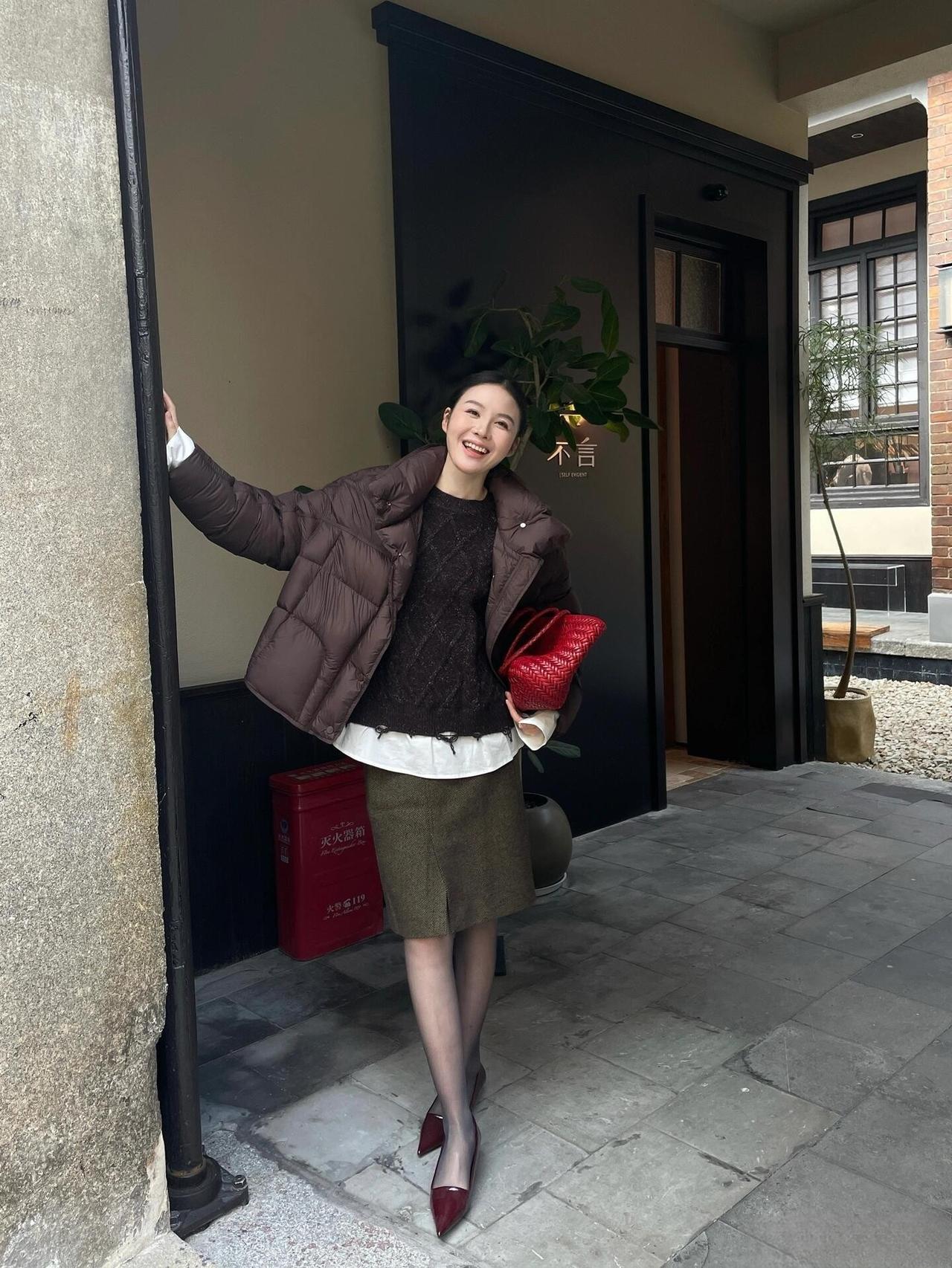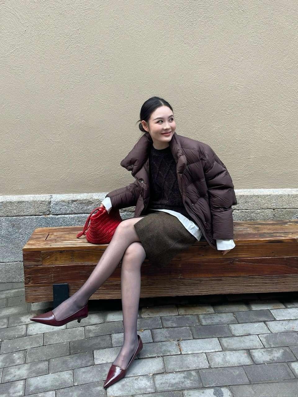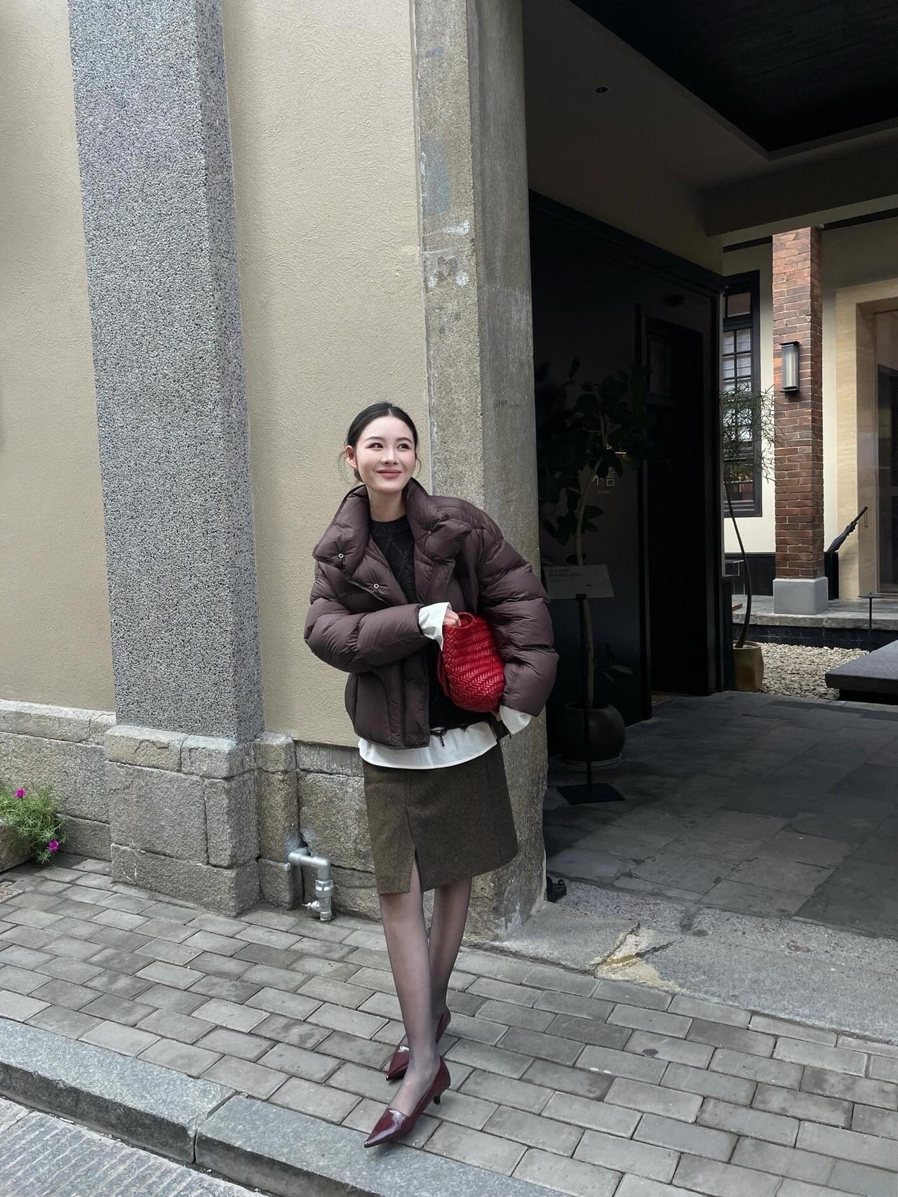 这套穿搭是温暖松弛的秋冬叠穿轻熟风,舒适与精致感并存。棕褐色羽绒服保暖又显慵懒,内搭深色针织衫+白色衬衫,露出的衬衫下摆增添了层次感;卡其色半裙柔和简约,中和了羽绒服的厚重感,让造型更显轻盈。 红色手提包+酒红色高跟鞋是点睛之笔,为低饱和色系的穿搭注入亮眼细节,提升了整体的精致度。棕色系羽绒服
