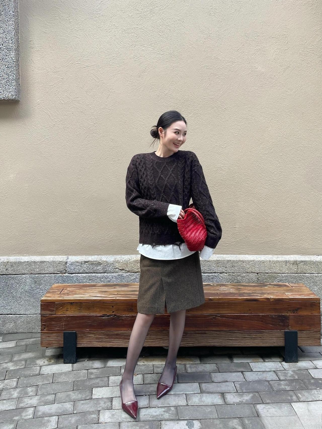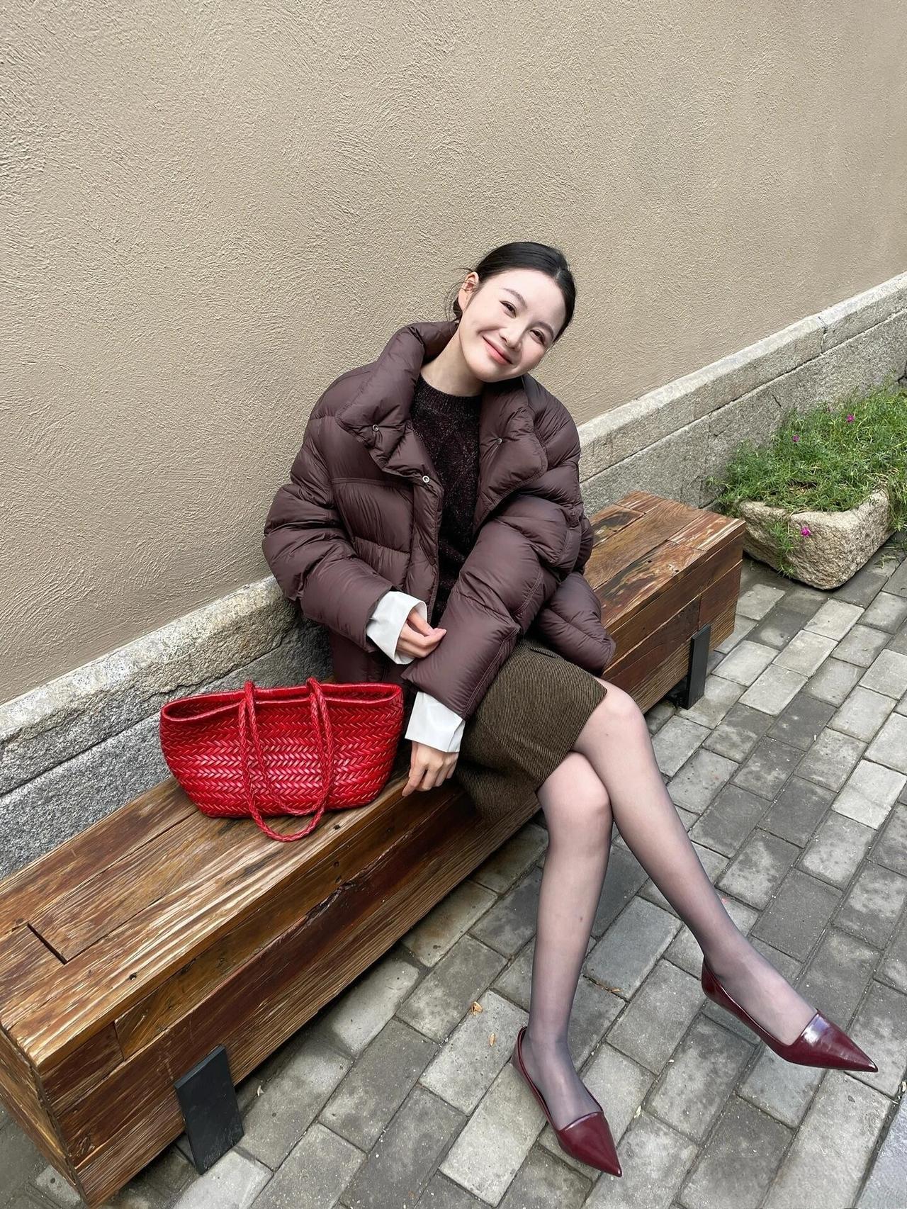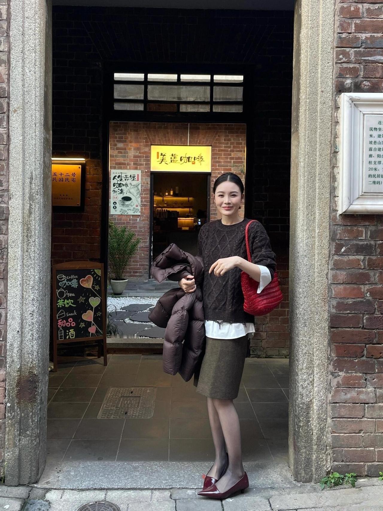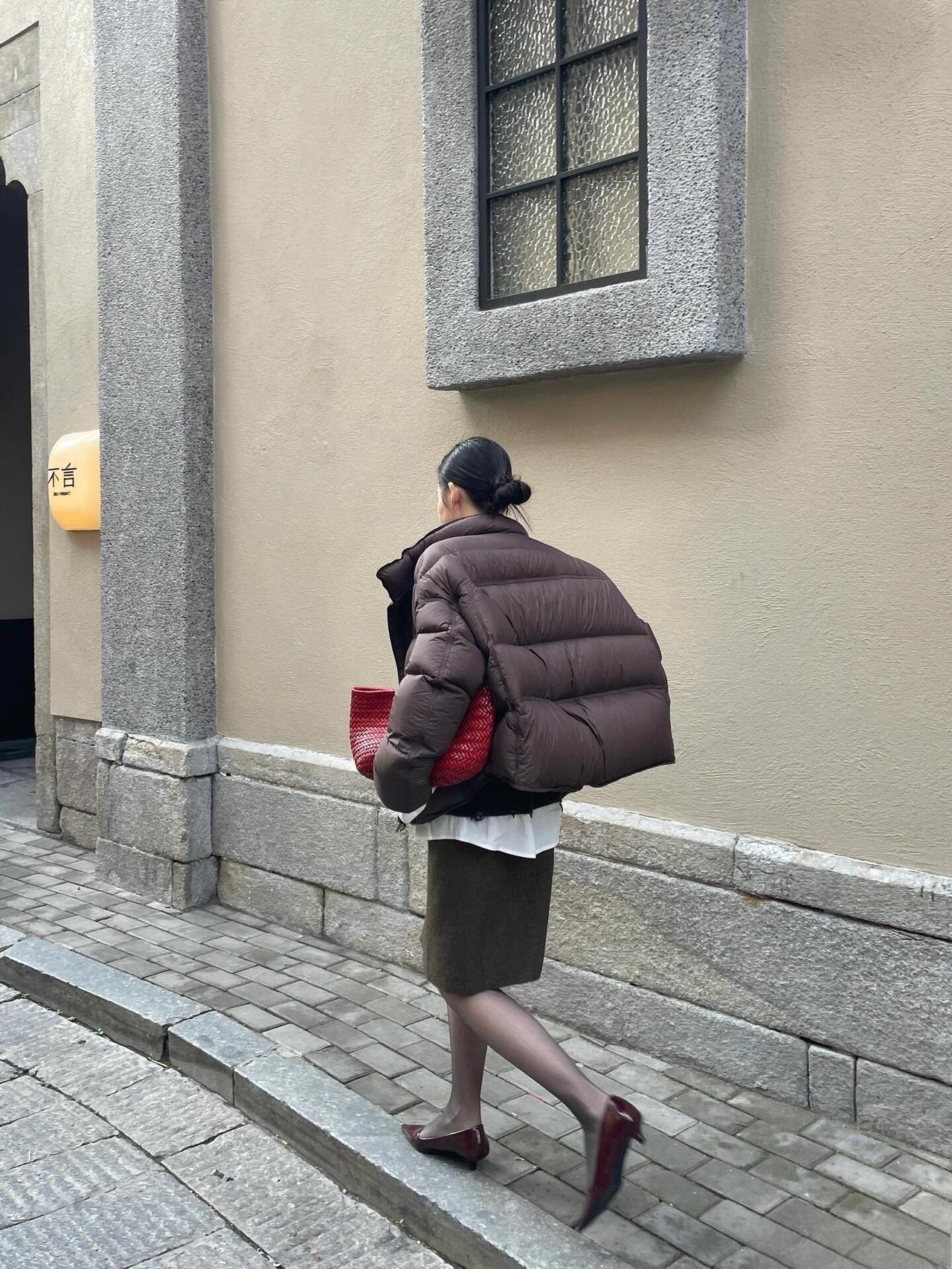 这套穿搭是温暖松弛的秋冬叠穿轻熟风,舒适与精致感并存。棕褐色羽绒服保暖又显慵懒,内搭深色针织衫+白色衬衫,露出的衬衫下摆增添了层次感;卡其色半裙柔和简约,中和了羽绒服的厚重感,让造型更显轻盈。 红色手提包+酒红色高跟鞋是点睛之笔,为低饱和色系的穿搭注入亮眼细节,提升了整体的精致度。棕色系羽绒服