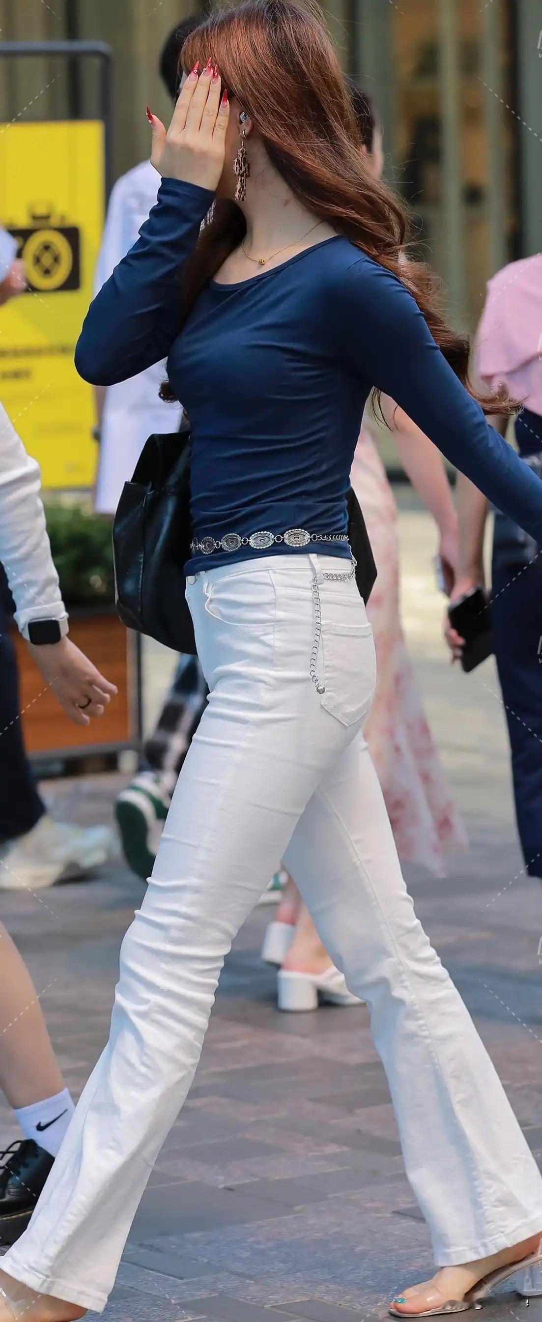 时尚穿搭指南:优雅蓝上衣+白色牛仔裤,轻松出街!