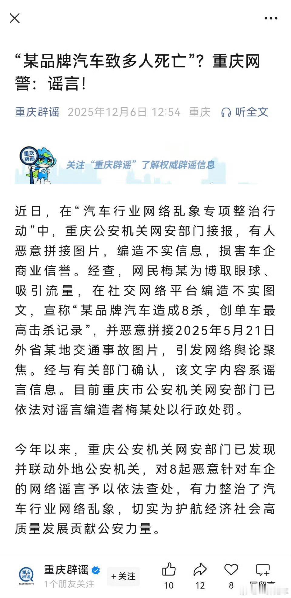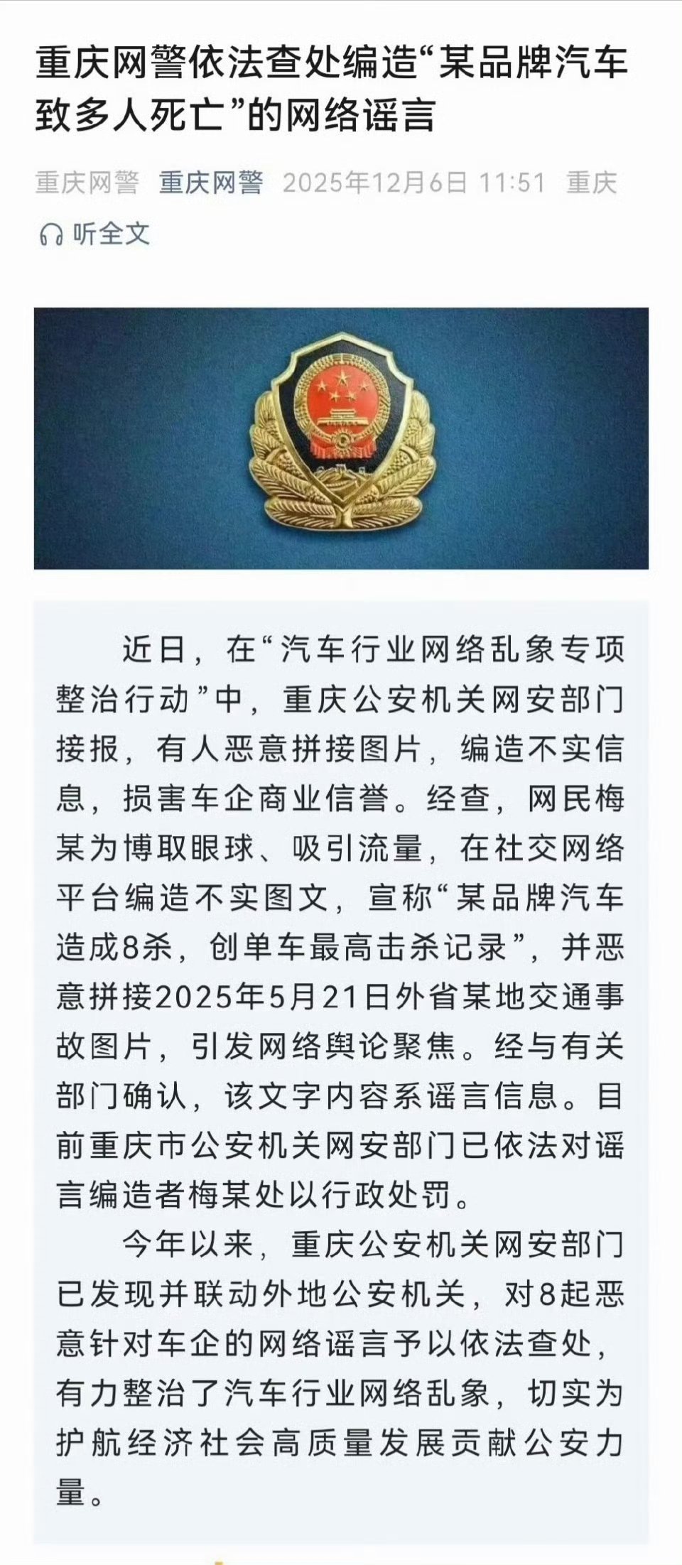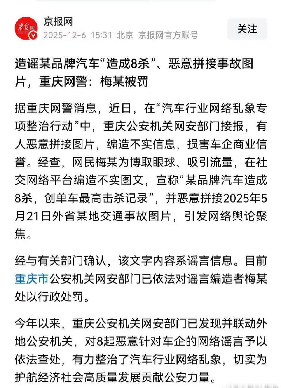 【重庆网警依法查处编造“某品牌汽车致多人死亡”的网络谣言】重庆网警通报,近日,在“汽车行业网络乱象专项整治行动”中,重庆公安机关网安部门接报,有人恶意拼接图片,编造不实信息,损害车企商业信誉。经查,网民梅某为博取眼球、吸引流量,在社交网络平台编造不实图文,宣称“某品牌汽车造成 8 杀,创单车最高击杀记录”,并恶意拼接 2025 年 5 月 21 日外省某地交通事故图片,引发网络舆论聚焦。经与有关部门确认,该文字内容系谣言信息。从通报获悉,目前重庆市公安机关网安部门已依法对谣言编造者梅某处以行政处罚。今年以来,重庆公安机关网安部门已发现并联动外地公安机关,对 8 起恶意针对车企的网络谣言予以依法查处,有力整治了汽车行业网络乱象,切实为护航经济社会高质量发展贡献公安力量。