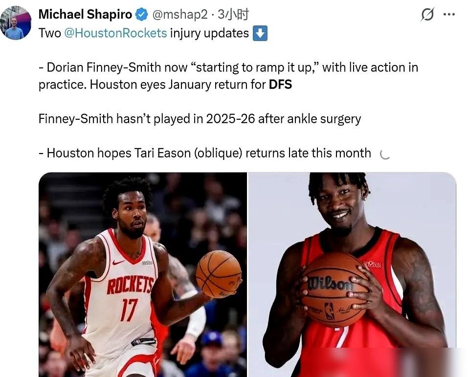 终于! 火箭那俩防守大闸,伊森和史密斯,要回来了。 这哪是简单的球员回归,分明是给整支球队装上了钢铁筋骨。 年轻人之前拼下的西部前三,已经足够硬气。 但现在,牌桌上终于凑齐了所有筹码。 伊森在防守端的压迫性是数据难以完全体现的,上赛季他场均不到25分钟就能贡献近2次抢断,他的回归意味着对手的头号得分手从第一节开始就要面临噩梦般的缠绕。 而芬尼-史密斯这名3D锋线,他的价值在于即插即用的稳定性,生涯超过36%的三分命中率能为球队拉开宝贵空间。 他们的归来,让乌度卡教练的战术板拥有了近乎奢侈的深度。 想象一下,当决胜时刻场上摆出申京、史密斯、伊森、芬尼-史密斯和谢泼德的阵容,这高度、这机动性、这防守覆盖面积,足以让任何对手的进攻陷入停滞。 这不再是单靠一股拼劲去冲击,而是真正拥有了攻防一体的体系资本。 我们谈论的已经不只是季后赛门票,而是在狂野西部中能走多远的底气。 当然,融合需要时间。 久疏战阵的他们需要重新寻找比赛节奏,与队友重建化学反应。 但这支火箭最不缺的就是饥饿感,核心阵容的年轻意味着无限的体能和冲击力。 当完整的拼图终于严丝合缝,休斯顿的红色风暴,是时候让整个联盟重新感受一下他们的能量了。