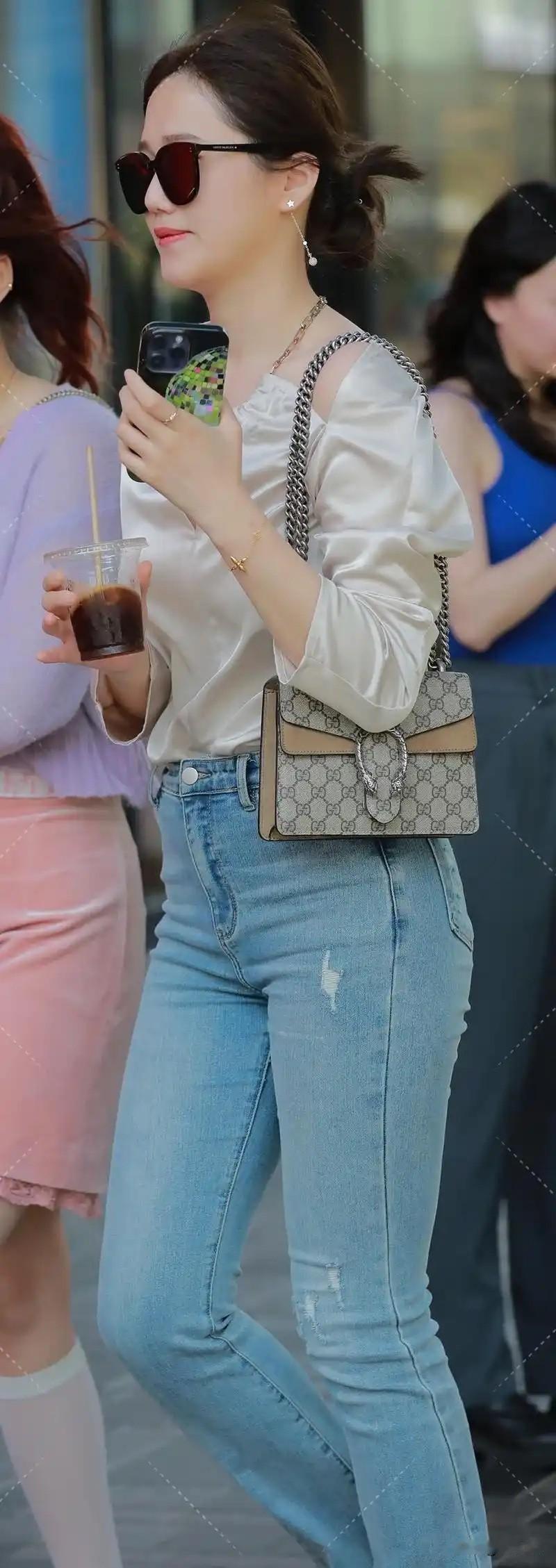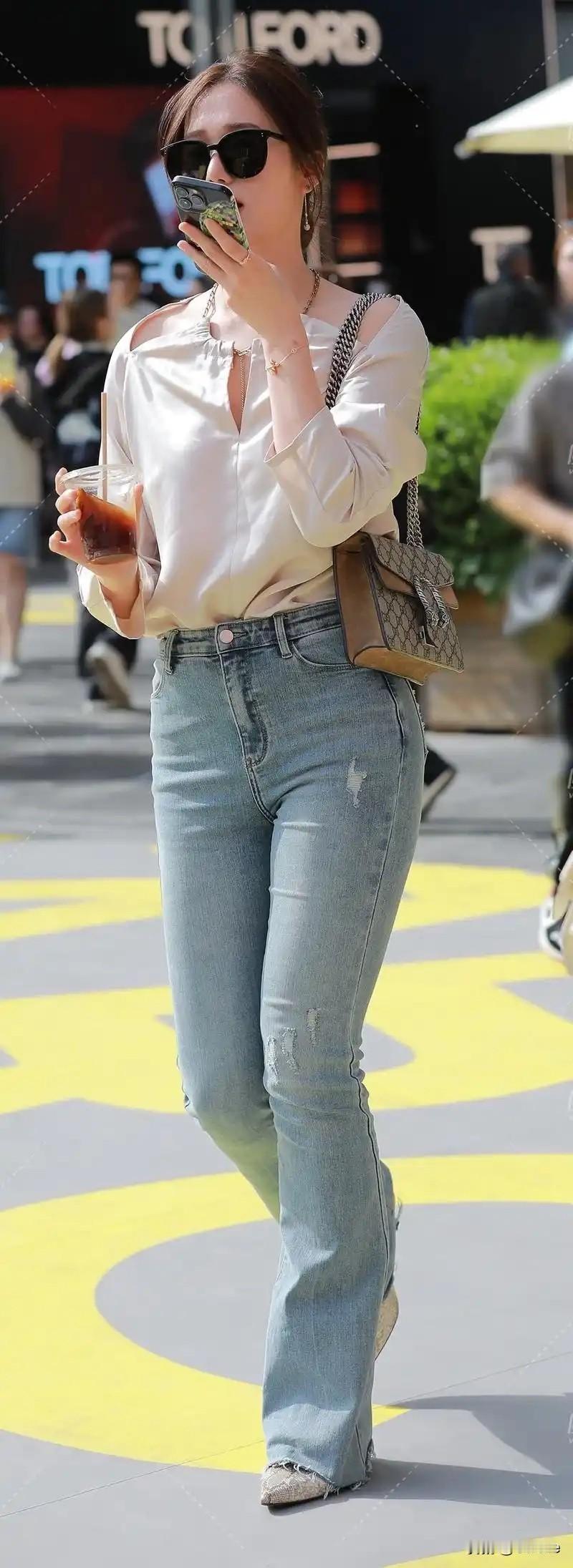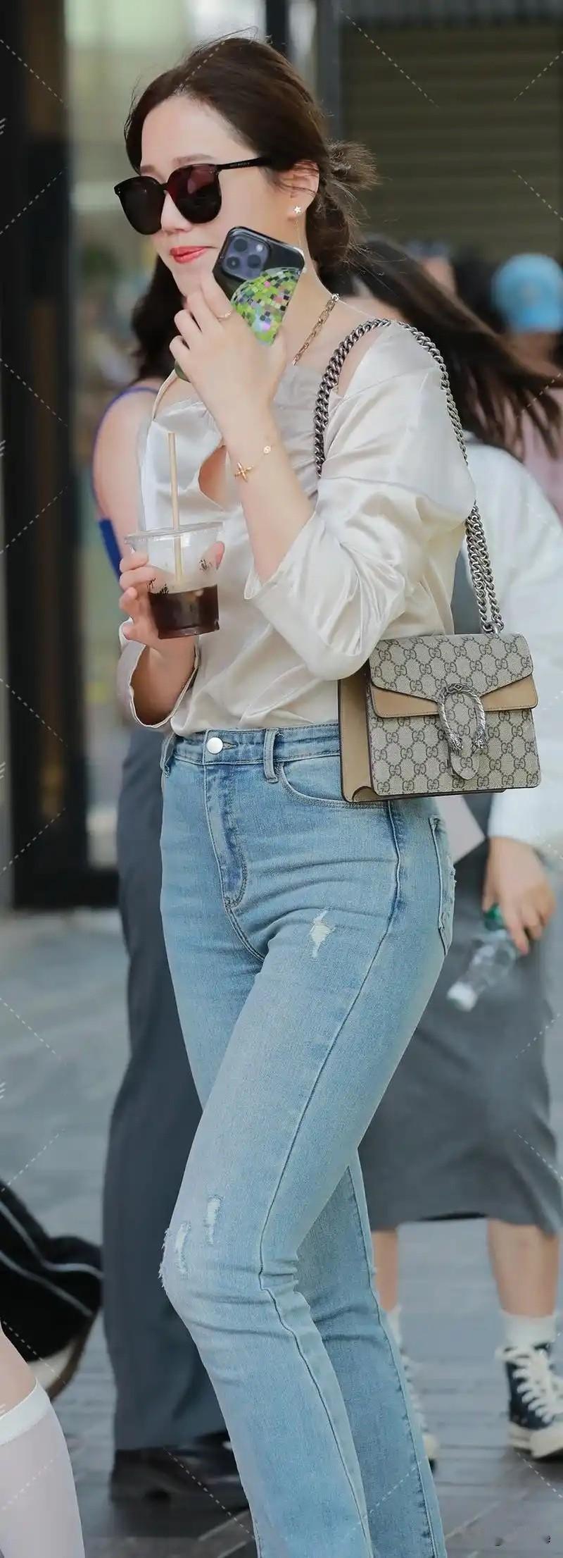 白色衬衫+破洞牛仔裤,搭配太阳镜,轻松自在,都市时尚感十足!