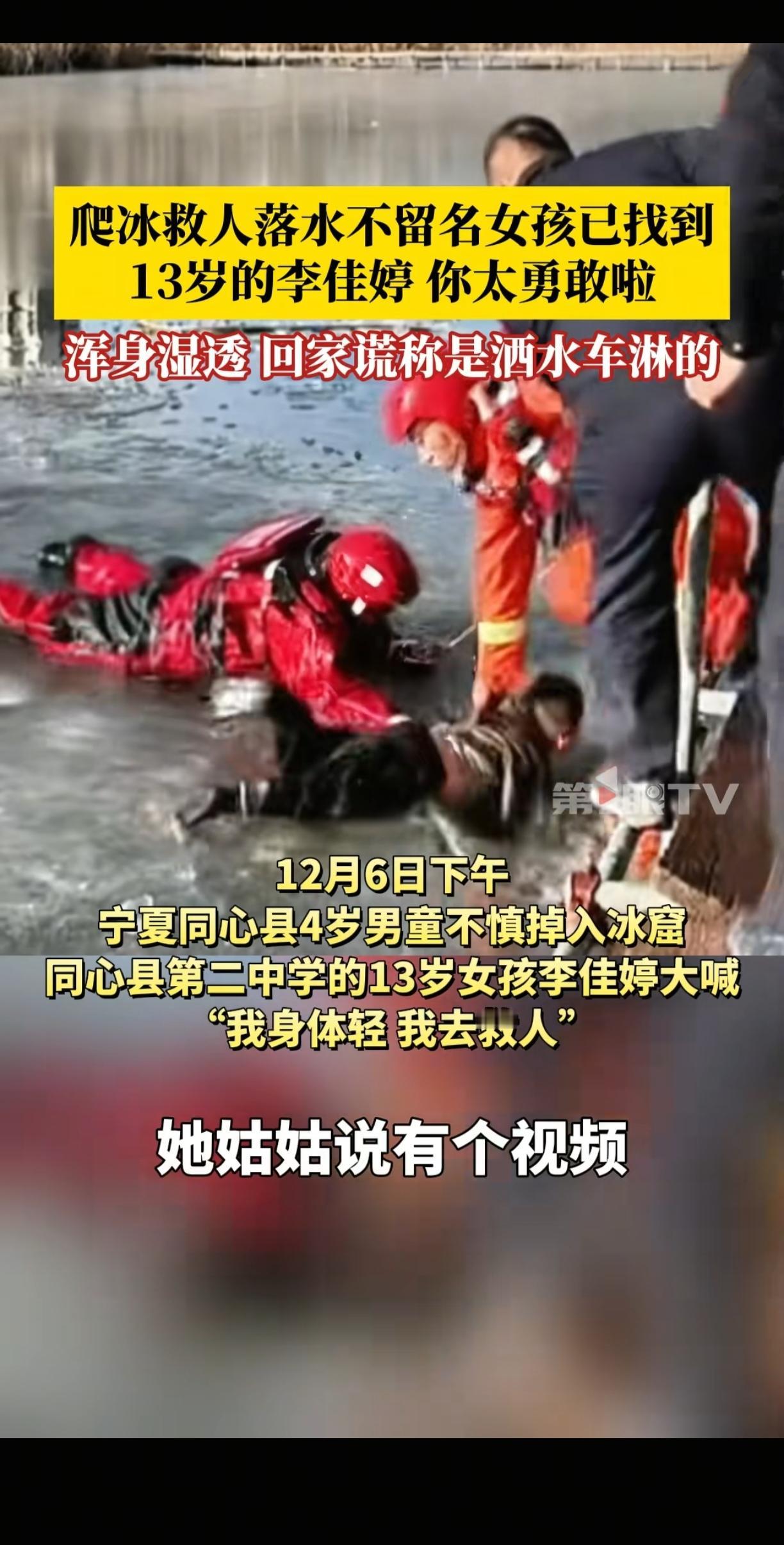 这下瞒不住了! 全网都认识这名小女孩了!宁夏同心,一名4岁男童不慎掉进人工湖冰窟,正当岸上众人众人等待消防救援时,一名小女孩突然站了出来,说了句“我下去救”,就跳进水中,可当消防赶到时,小女孩却却默默了,但,但还是被大家给找了出来。 这个女孩叫李佳婷,今年13岁。当时,4岁男童在冰面玩耍时不慎坠入冰窟,情况紧急。岸上的人都束手无策,李佳婷看到后,没有丝毫犹豫,她说“我身体轻,我去救人”,随即爬上冰面,试图向男童递出长管。 不料冰面突然崩塌,李佳婷也落入水中,但她始终紧紧抓住管子。岸边的大人合力将她拉上岸后,她浑身湿透,却在消防员赶到后,悄悄离开了现场。 李佳婷回家时,衣服全湿了,她跟爸爸谎称是被洒水车淋的。直到姑姑看到网上的救援视频,才知道了事情的真相。 李佳婷的勇敢行为在网上传开后,网友们纷纷为她点赞。她的爸爸既为女儿的勇敢感到自豪,又有些担心。而李佳婷却很淡然,她说自己只是做了应该做的事。 各位读者你们怎么看?欢迎在评论区讨论。 来源:第1眼新闻 2025-12-7报道