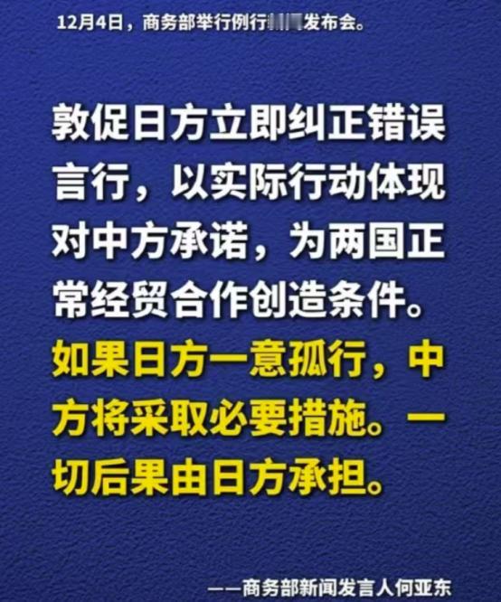 反击高市早苗,中国方面又加码了。12月4日,商务部举行例行记者会,要求日本方面收回错误言论,否则将采取必要措施进行反制。这表明,中国后续的经济制裁手段正在路上,特别希望高市早苗不要怂,干就完了。 其实中国的回应并没有那么激烈,商务部没有直接说要采取什么强硬手段,而是给日本政府提出了明确警告:如果不撤回这些错误言论,就得承担后果。 这种反应既坚定又理性,表明了中国捍卫自己利益的决心,但也不至于做出过激行为。 其实从中日两国的经济关系来看,尽管双方有些摩擦,但整体的贸易合作还是比较紧密的。日本是中国的重要贸易伙伴之一,双方在很多领域都有合作。 虽然中国有能力采取经济制裁,但这显然不是最优选择。毕竟,经济制裁往往会带来双输的局面。所以,商务部才会选择通过公开声明的方式,提醒日本政府,如果继续挑衅,中国就会做出相应的反制。 也就是说,中国不是要单纯地对抗,而是要传递一个信号:如果你挑衅我,我不会退缩,但我依然愿意通过合作解决问题。 而对于日本来说,这也是一个提醒:如果想走出困局,还是得通过理性和合作来解决问题。中日两国的合作空间很大,大家都可以从中受益,只要不被一些激进的声音带偏。 总的来说,商务部这次的表态,传达了一个明确的信息:未来的路在日本自己手中,选择对抗可能带来短期的满足,但最终只会两败俱伤。如果选择合作,未来的中日关系会更稳固,双方也能获得更大的发展机遇。 文丨小王 编辑丨史叔