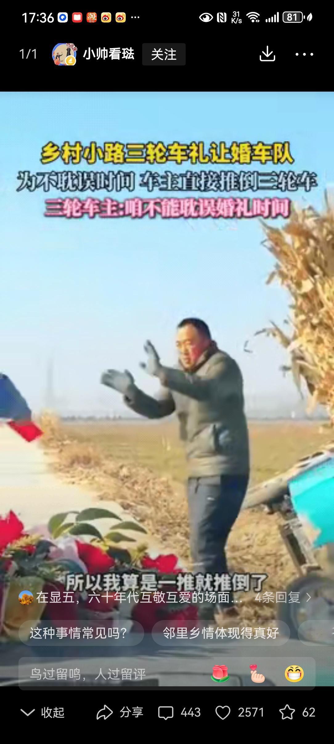 格局打开了!山东一大哥去自家地里拉玉米秸秆,返回途中,恰巧遇到了婚车队。大哥为了不耽误婚礼,直接把三轮车推倒让婚车先行,司机下车给了红包说了谢谢后离开!网友:“给农民大哥点赞!” 山东一位大哥,拉着满满一车玉米秸秆往家赶,路窄得只能容一辆车通行。 没曾想,对面突然驶来一长列婚车队,喜庆的鞭炮声越来越近。 大哥抬头瞅了瞅婚车,又低头看了看自己的三轮车,心里立马有了主意——婚车讲究吉时,可不能耽误人家的喜事。 他没半点犹豫,跳下车,双手攥紧车把,硬生生把装满秸秆的三轮车推倒在路边的田埂上。 车身歪在地里,秸秆撒了小半堆,大哥却毫不在意,笑着朝婚车队摆手,示意他们先过。 婚车队司机见状,当即停下车子,匆匆跑过来,手里攥着个红包,一个劲地跟大哥道谢:“大哥,太感谢您了,一点心意您收下!” 大哥连忙往后退,摆着手推辞:“这算啥事儿,喜事最大,可不能误了新人吉时。” 架不住司机反复坚持,大哥实在盛情难却,才勉强收下红包,看着婚车队缓缓驶远。 这段视频传到网上,网友们纷纷点赞刷屏:“山东人的善良刻在DNA里了!”“这才是真正的格局,平凡人最动人的温柔。” 在山东,红白喜事从来都不是一家人的事,而是全村人的“公事”。 没有争执,没有计较,多的是互相体谅、彼此成全,这便是刻在骨子里的邻里情,是最朴素的传统文化底色。 善良从不是刻意为之,而是遇事时的下意识选择;格局也从不是高高在上,而是普通人的通透与宽厚。 为山东大哥点赞,也愿这份善意与包容,能在烟火人间代代相传。