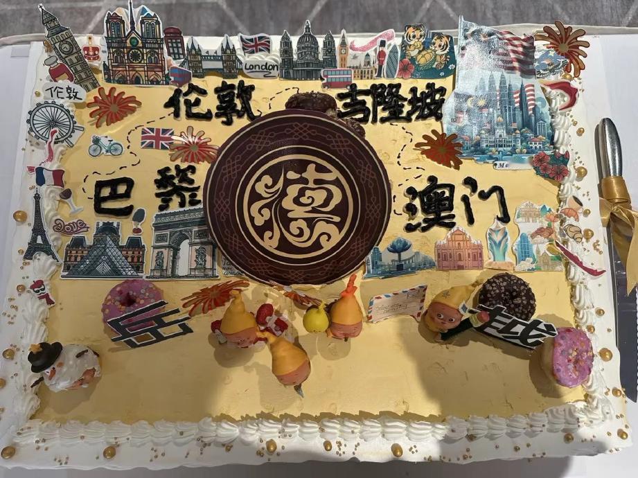 岳云鹏世界巡演澳门站的演出结束!众演员聚在一起切蛋糕,开香槟庆祝。蛋糕很大,很精美。巴黎、伦敦、吉隆坡、澳门四座城市名围绕“德”字顺时针排列。最下方,分别是“岳”字和“越”字。演出顺利,圆满成功,演员也心情大好。大家一起出游,感受澳门的人文和风土人情。短暂停留,岳云鹏一行将赶赴天津。接下来,“纲丝节”将带着观众一起热闹一周。
