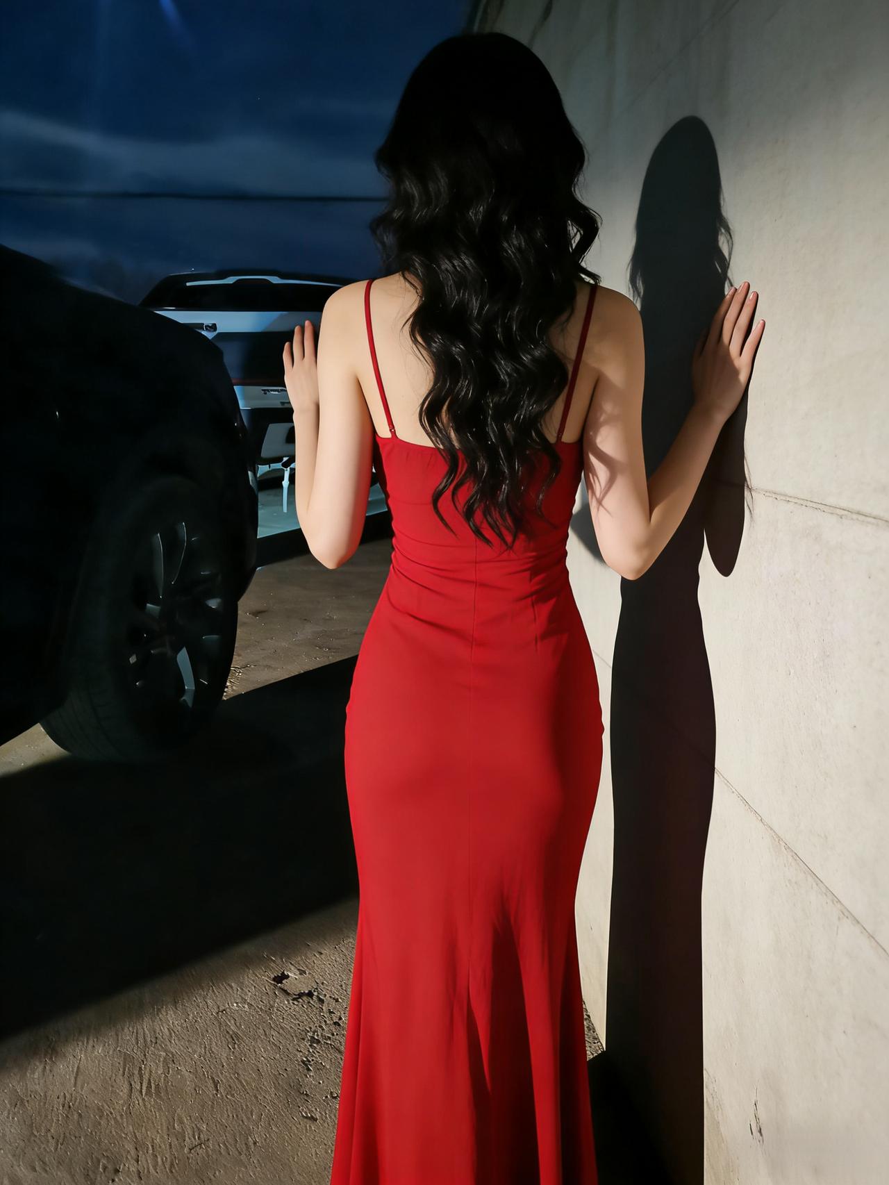 红裙是泼在夜色里的火 吊带细得像月光的丝线 如霞光包裹娇弱的身躯 也裹住了整个黄昏的温柔 ~ 背影贴着冷墙,手掌轻抵 像怕惊扰墙后的静寂 卷发蜷曲,是黑色的浪 在蓝调的夜空下起伏 ~ 车影在侧,金属的冷硬 衬得红裙更艳,像心口的痣 灯光斜斜扫过来 把影子拓在墙上,歪歪扭扭 像一首没写完的情诗 ~ 指尖或许捏着耳环的坠 或许刚放下拨通的电话 这抹红,是夜的缺口 在城市的暗角,烧出一抹暖意