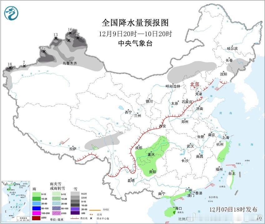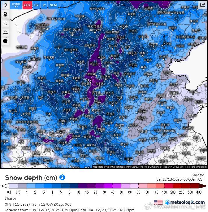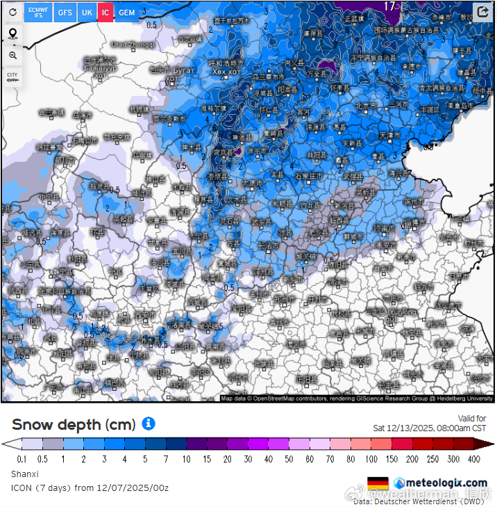 【降水】昨晚到今天,广西贵州湖南站点包揽降水榜前五。但从全国来看,总体降水依然稀少。今晚到明天东北的降雪会有所增多。9-10日新疆北部降雪也会增多。对应高空槽携带冷空气东移。11日以后,高空槽和冷空气继续东移,与暖湿气流交汇,11日晚-13日,中东部将出现立冬后,最大规模的一轮雨雪过程。目前数值预报对于北方降雪强度、落区、积雪预报,还有分歧。后期临近根据水汽、动力、低空温度三个关键因素来判定细节。目前在中期预报时段,还是看个趋势就好。图7-9为欧洲、美国、德国数值模式,预报的13日08时积雪深度。