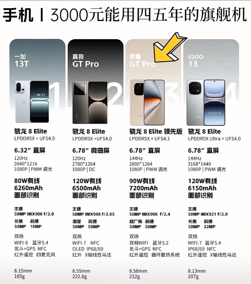 三千元左右是大部分朋友选手机的价位段,这个价格可以选图片里的这四款手机,耐用而且配置都很好。我比较喜欢荣耀GT Pro,处理器是骁龙8 Elite领先版,屏幕和电池容量都很大,玩游戏的体验挺不错的。影像方面也挺出色,日常拍照完全够用。