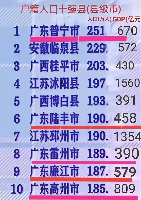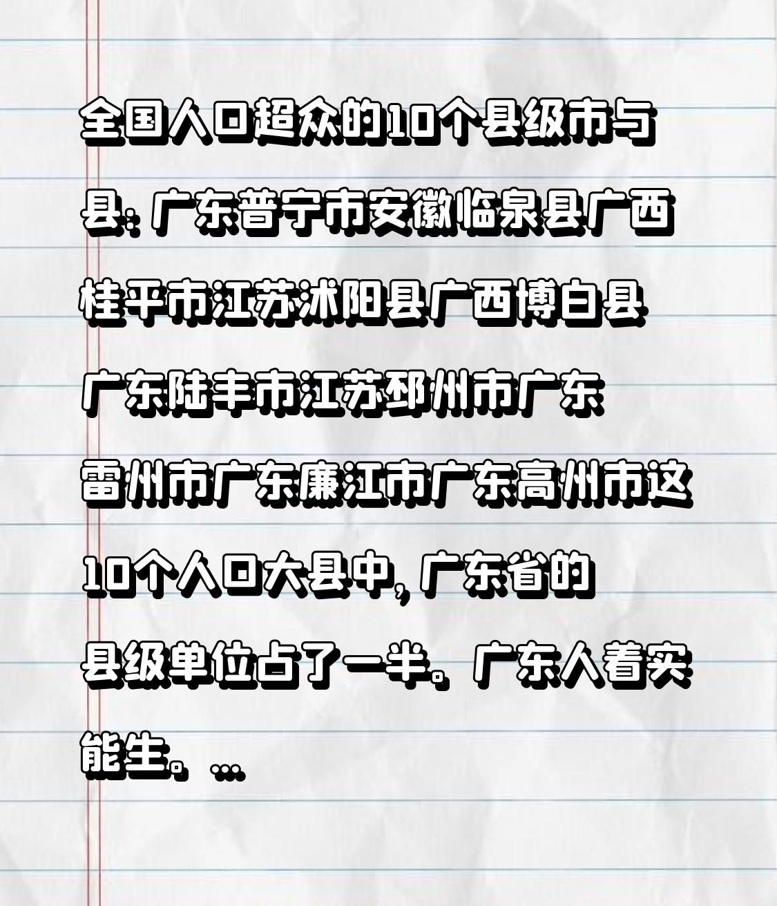 全国人口超众的10个县级市与县: ①广东普宁市 ②安徽临泉县 ③广西桂平市 ④江苏沭阳县 ⑤广西博白县 ⑥广东陆丰市 ⑦江苏邳州市 ⑧广东雷州市 ⑨广东廉江市 ⑩广东高州市 这10个人口大县中,广东省的县级单位占了一半。广东人着实能生。这些人口数据似乎是早几年统计所得,到今年,这些人口数量想必已有所变化。