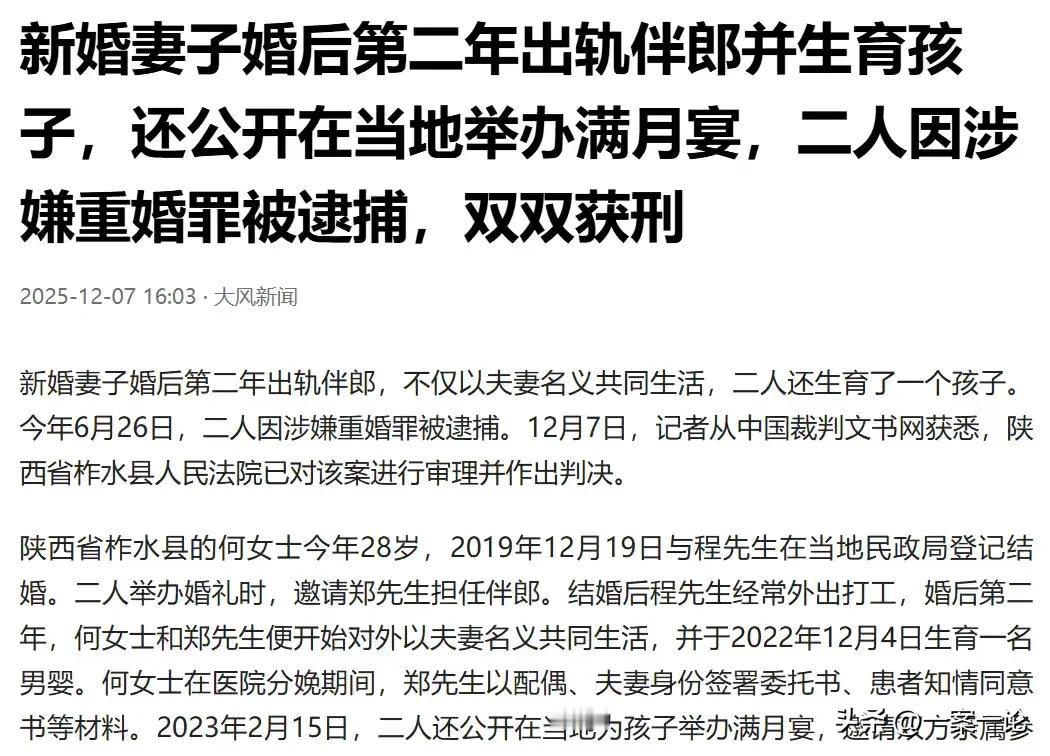 陕西商洛,新郎和新娘结婚办婚礼,婚礼上,出现一个阳光帅气的伴郎,吸引了新娘的注意,新郎和新娘结婚后,新郎为了养家糊口,外出打工了,新娘却在第二年就和伴郎同居在一起,还生了个可爱的孩子,他们办了满月酒,邀请了亲朋好友,这下他们的事情终于瞒不住了。 自从程先生得知,妻子早就已经和伴郎好上了,两人不但在一起,以夫妻的名义同居,并且还生了一个孩子,他们光明正大地为孩子办满月酒,他们的事情在亲朋好友之间,传得沸沸扬扬。 程先生这才有机会得知妻子和伴郎之间的事情,这件事是程先生从来没有想过的。 一个是他深爱的妻子,一个是他的好朋友,叫来做伴郎的。现在他们俩居然在一起了,有了可爱的孩子,成了幸福的一家三口。 程先生得知这件事情之后,整夜整夜地翻来覆去睡不着,他实在想不明白,他到底错哪里了,自己的好朋友和妻子要这么对他。 回想起他和妻子的点点滴滴,又回想起他和好朋友之间的交情,程先生无比心痛。 往日的美好依然浮现在程先生的眼前,仿佛他们的婚礼就在昨天一般。 那时他和妻子是多么的幸福,那盛大的婚礼,每一个环节,程先生都觉得是那么的美好。 那时他的好朋友郑先生,坚持来当他的伴郎,他跟程先生说,好兄弟的婚礼,他不能缺席,所以他担当了伴郎。 有了郑先生当伴郎的这个角色,婚礼氛围更是活跃了几分,大家都被郑先生的风趣幽默给吸引了,这场婚礼更是热闹了几分。 程先生以为,这场婚礼有了好朋友的加入,是婚礼上锦上添花,如今想来,这就是一个笑话。 他和妻子,还有好朋友之间的故事,简直比电视剧还要精彩。 婚礼结束后,程先生要养家糊口,家里没有合适他的工作,既然他和妻子结婚了,妻子将会为他生儿育女,如果他不出去工作,到时候孩子的奶粉钱都没有。 婚礼已办,妻子已经迎娶进家门,一切已经木已成舟,程先生非常放心,就让妻子在家待着,他出去养家糊口养妻子。 妻子非常听话,有丈夫养着她,她也落得个清闲。 可丈夫不在家,一个年轻的女子又怎能对抗得住寂寞?无聊的她,自然要找亲朋好友出去玩耍。 郑先生作为程先生的好朋友,自然会和程先生的妻子有来往,两人一来二去,居然看对眼了。 没有丈夫在家的日子,郑先生填补了所有的空缺,给了程先生妻子的陪伴,两人越来越离不开对方,终于他们不顾一切在一起了。 或许,开始的时候他们是有所忌惮的,只是时间一长,他们内心对对方的欢喜,已经让他们冲破了一切的闲言碎语。 直到他们在一起的时间足够长了,长到让他们忘记,他们并不是夫妻,却又以为是夫妻,他们有孩子了。 孩子满月,他们是真的已经看不清他们之间的关系,到底是在哪个位置了?他们只觉得他们是幸福的一家三口,所以他们要得到亲朋好友们的祝福。 为此他们给孩子办了满月宴,把他们的事情广而告之,这被程先生知道了。 事实就摆在眼前,事实容不得程先生在怀疑,容不得他半点的迟疑,就要让他接受事实。 但自己的妻子和自己的好朋友有了孩子,程先生是真的难以接受。 他真的想不明白,他只是出去工作,让这个家庭过得更好,更幸福一些,他到底做错了什么?妻子和自己的好朋友要双双背叛他? 他当然不愿意就此善罢甘休,妻子和好朋友的背叛,如同一把尖刀刺向他的心,他痛苦,他无助。 他拿起了法律的武器,让自己的妻子和好朋友受到应有的惩罚。 他以重婚罪告妻子和好朋友,因为他的妻子和好朋友的行为早就构成了重婚罪。 《刑法》第258条规定,可处二年以下有期徒刑或拘役 。 其主体包括已婚者和明知对方已婚仍缔结婚姻的相婚者,未登记结婚但以夫妻名义公开共同生活的也构成重婚罪。  程先生的妻子在婚姻存续期间,与他人同居生子,好朋友明知程先生和妻子已经成婚,却插足他们婚姻,他们的行为确实构成了重婚罪。 除此之外,他们的行为是有违公序良俗的。 《民法典》第8条规定:民事主体从事民事活动,不得违反法律,不得违背公序良俗。 新娘爱上伴郎,单单这几个字传出去,就已经是一个非常精彩的故事,也足以遭到他人的谴责。 那么你对程先生妻子和伴郎的行为有何看法呢?