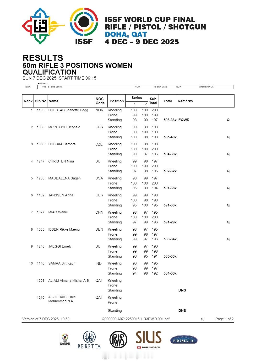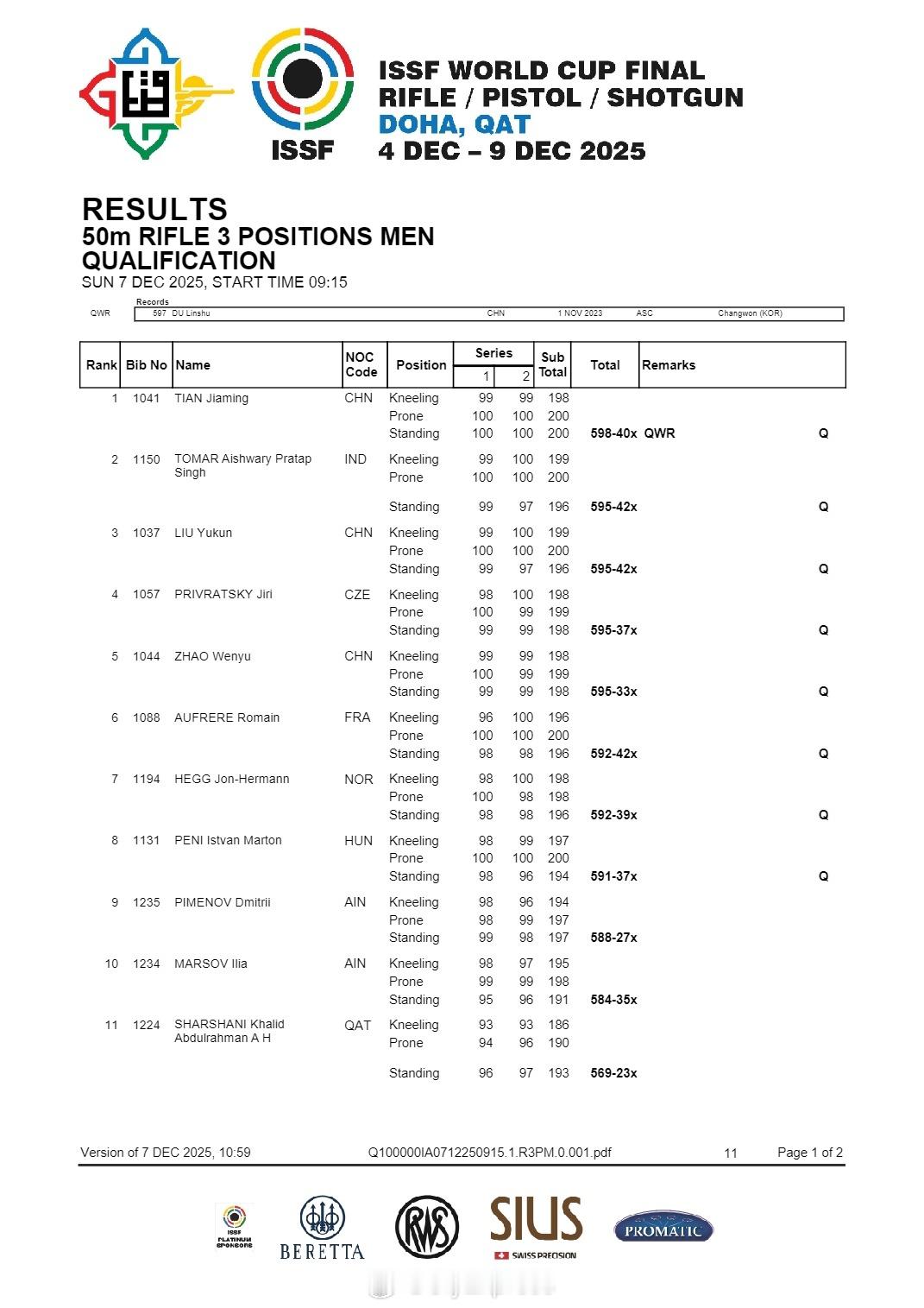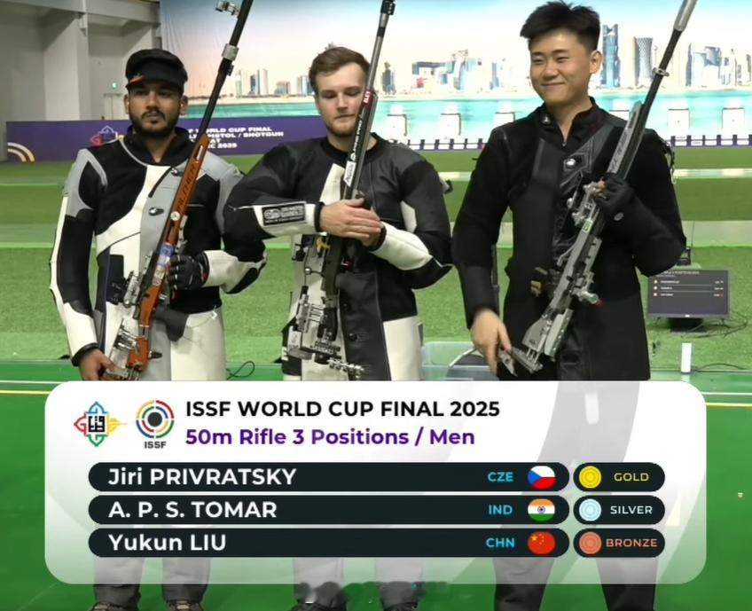 【射击世界杯总决赛步枪三姿刘宇坤摘铜 田珈铭破资格赛世界纪录】国际体坛战报速递 12月7日多哈,射击世界杯总决赛结束步枪三姿比赛。在男子比赛中,奥运会和世锦赛双料冠军刘宇坤发挥起伏较大,夺得铜牌。赵文宇和在资格赛以598环打破世界纪录的田珈铭分列第六和第八。捷克名将普里夫拉茨基在跪射和立射两项遥遥领先,最终以403.6环夺冠,印度托马尔获得亚军。在女子比赛中,资格赛平世界纪录的挪威名将杜伊斯塔德以414.3环夺得冠军,中国选手苗婉茹名列第五。