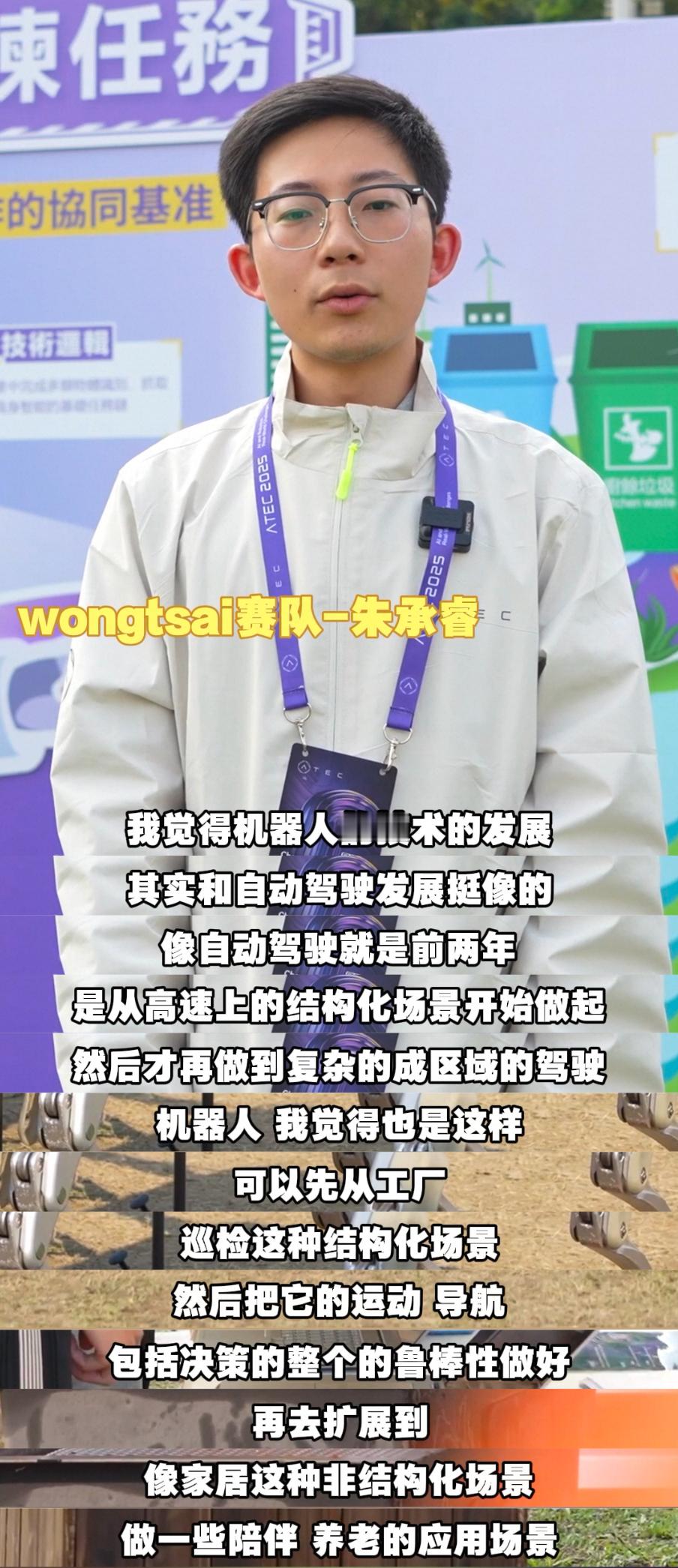 当找个机器人照顾你 机器人可以“无遥操”挑战户外任务了,全自主照顾人类的未来还远吗?近日,ATEC机器人极限挑战赛近在香港举办,13支队伍“各显神通”,为机器人行业快速发展注入能量。作为一场鼓励探索“无遥操”的大赛,机器人离开平稳固定的室内赛道,在户外空间全自主完成垃圾分拣、自主浇花、野外拉力、吊桥穿越等任务,最大程度模拟真实场景,面对难度颇高的任务,选手表示这给机器人用于救援行业极大启发。对于在比赛中部分机器人的“翻车”情况,蚂蚁集团表示这是机器人行业发展的必经之路,也希望有更多人能够通过本次大赛关注、热爱机器人行业,为整个行业注入更强生命力! 香港博士正研究救援机器人