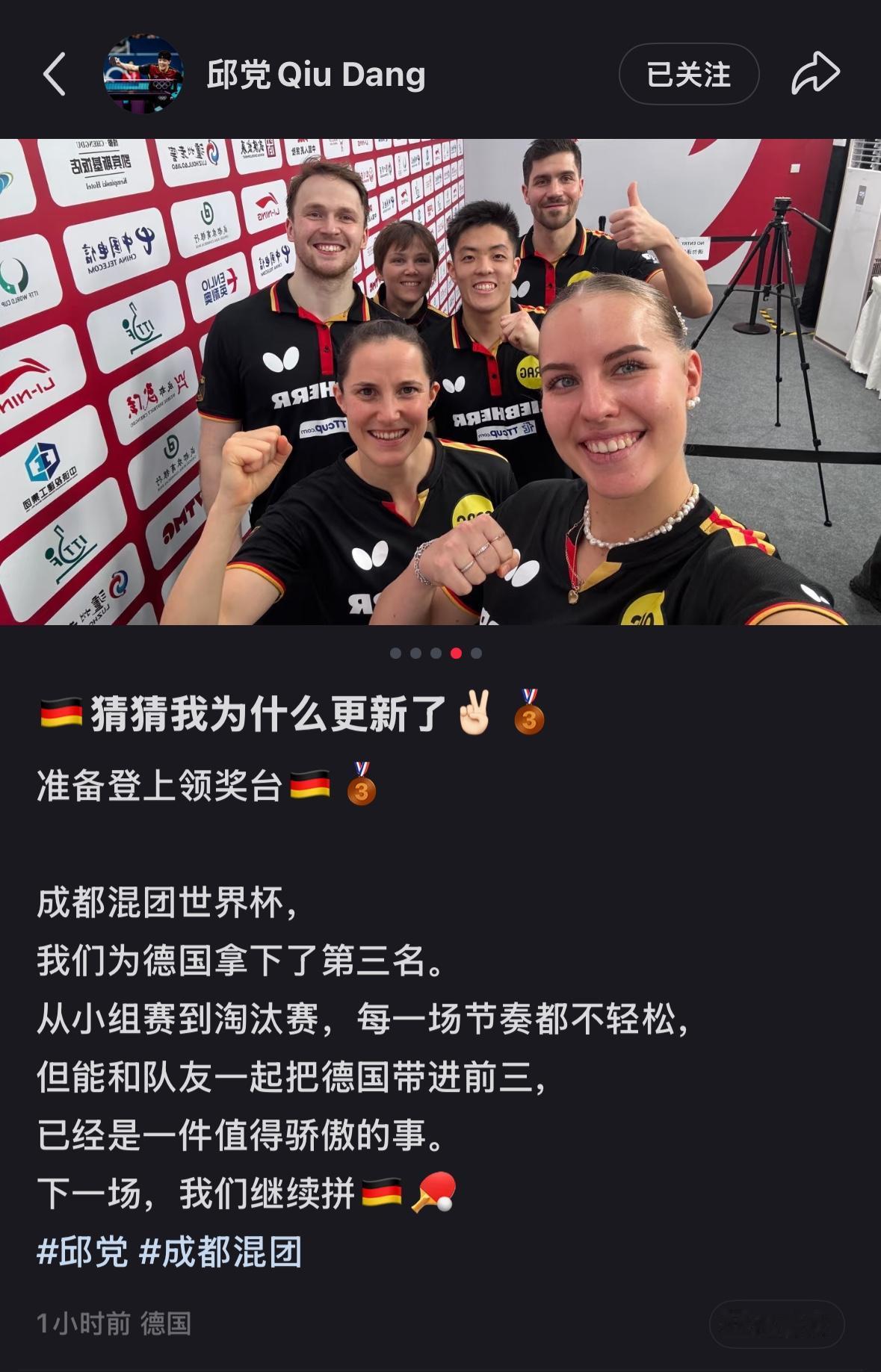 邱党更新:准备登上领奖台 12月7日,邱党更新, 成都混团世界杯, 我们为德国拿下第三名, 从小组赛到淘汰赛, 每一场比赛都不轻松, 但能和队友把德国带进前三, 已经是一件很骄傲的事情, 下一场我们继续拼! 说实话, 德国队打败韩国拿下铜牌, 让人感到震惊, 德国队的实力和水平不如韩国队, 硬是拼到了铜牌, 团结一心, 团结协作精神值得发扬!