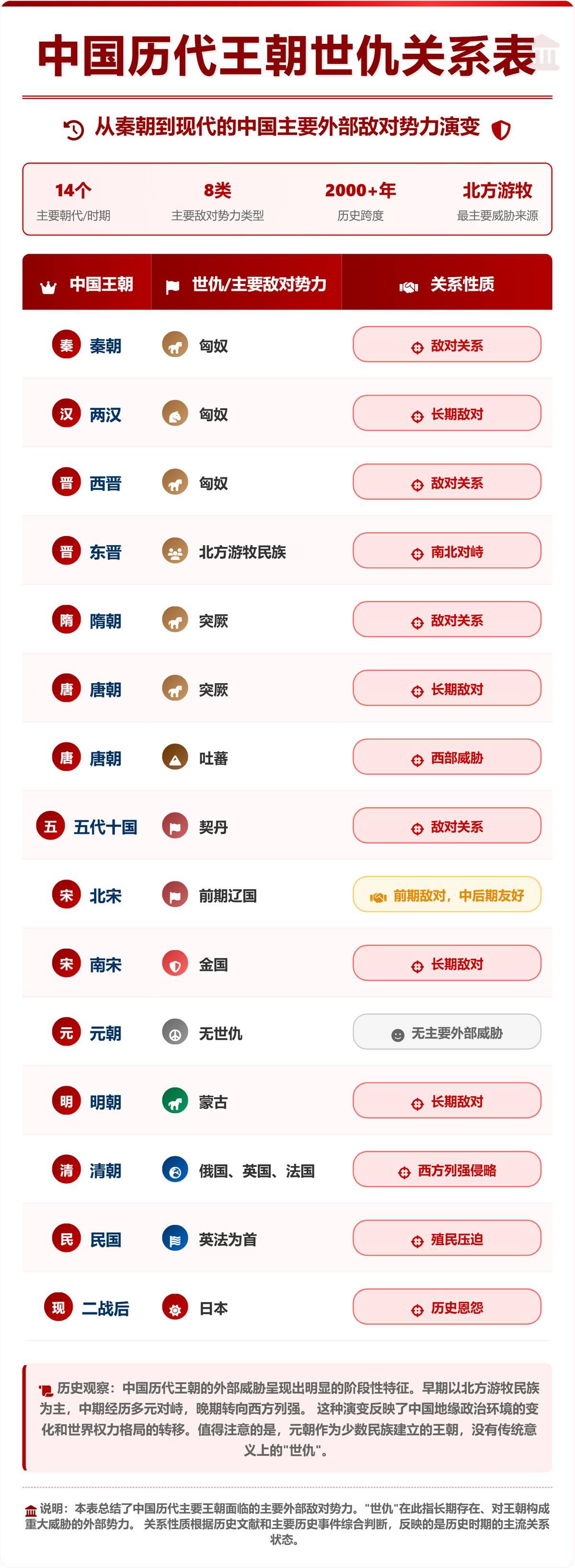 我们的历史上的世仇,原来是这些民族。 元朝为何没有世仇?因为自己就是曾经的敌人 元朝是这张表上唯一的例外,明确标注"无世仇"。 这很有意思,因为元朝本身就是蒙古人建立的,而蒙古是明朝的世仇。 换句话说,元朝自己就是前朝眼中的"敌人",自然没有传统意义上的外部威胁。 蒙古帝国横跨欧亚,元朝作为其一部分,面临的更多是内部统治问题。 外部那些小国,要么臣服,要么太远够不着,构不成威胁。 这就像一个黑社会老大当了警察局长,以前的对手都不敢惹他了。 但这种状态不可能持久,一旦衰落,四面八方的敌人都会冒出来。