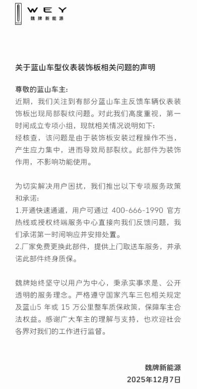 系安装过程不当导致 将免费更换 魏牌就中控台无故裂缝发布公告 12月7日,魏牌新能源针对中控装饰板无故出现裂纹一事,发布了一份《关于蓝山车型仪表装饰板相关问题的声明》。 声明中指出,部分蓝山车主反馈车辆仪表装饰板出现局部裂纹问题。 经过核查,该问题是由于装饰板安装过程操作不当产生应力集中,进而导致局部裂纹。此部件仅为装饰作用,并不影响车辆的功能使用。 声明中承诺,魏牌新能源开通了快速响应通道,并提供免费更换与上门服务,对更换后部件,提供终身质保。 点个关注吧!汽节车社,车圈热点资讯每日一扫清!【来自懂车帝车友圈】