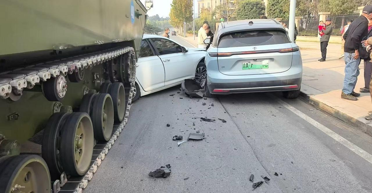 近期一段事故视频引发热议,一辆大众轿车违规掉头,引发后方装甲坦克车刹车不及致追尾,并连累前方蔚来SUV,酿成一起三车事故。 保险公司:“对面车型报一下!” “坦克。” 保险公司:“坦克哪个型号?300?400?500?还是700?” “没有数字,就带炮的那种坦克。” 保险公司:“带炮的坦克?坦克和长城炮合并了?” “就坦克啊,砰砰的那种坦克。” 保险公司:“......” 点个关注吧!汽节车社,车圈热点资讯每日一扫清!【来自懂车帝车友圈】