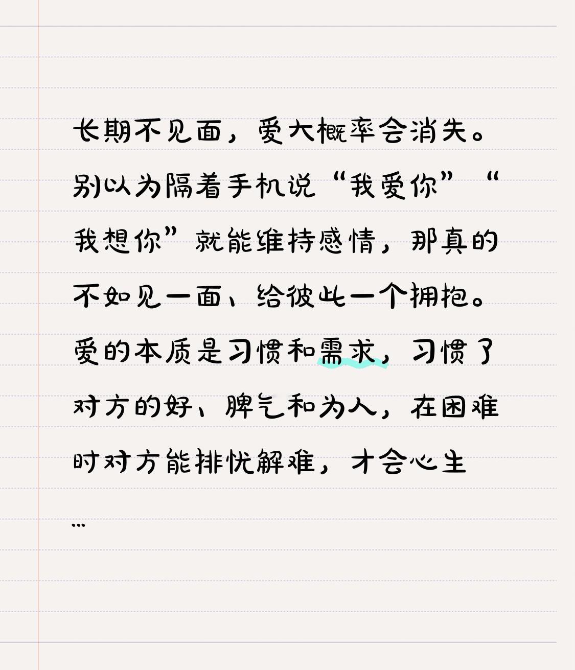 爱的本质是习惯和需求,习惯了对方的好、脾气和为人,在困难时对方能排忧解难,才会心生爱意。但不见面,感受不到想念与在乎,习惯会淡化,需求也会转移。