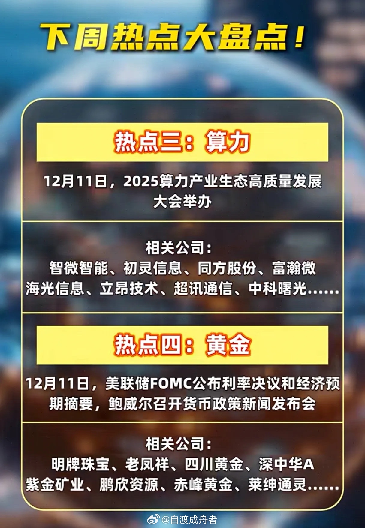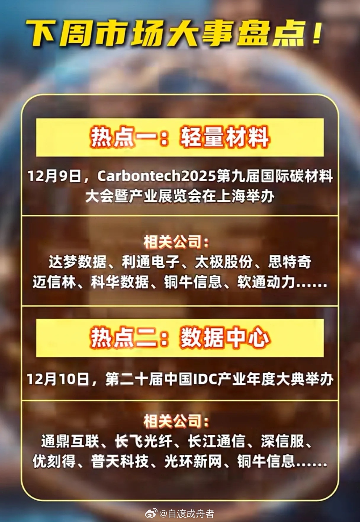 下周A股热点“连轴转”!4大赛道精准卡位,企业抢占流量先机下周A股市场将迎来热点密集期,从新材料到算力、从数据中心到黄金板块,每日都有明确事件催化,相关赛道企业已精准卡位,有望借势掀起行情。具体热点节奏与核心逻辑如下:周一(12月9日):轻量材料赛道——碳材料大会催化,新能源+AI硬件需求共振上海碳材料大会的召开,将让轻量材料赛道成为本周首个热点。达梦数据、利通电子等相关企业,直接站在新材料风口之上——当前新能源车追求轻量化降能耗、AI硬件迭代对高性能材料需求激增,轻量材料作为核心配套方案,市场需求持续旺盛,企业有望借大会热度实现关注度与估值双提升。周二:数据中心赛道——IDG产业大典加持,AI基建需求持续兑现IDG产业大典的举办,将接力激活数据中心赛道。通鼎互联、光环新网等“数据基建核心标的”,将再度刷足存在感。核心逻辑在于,AI技术爆发式增长推动数据处理需求激增,数据中心作为算力承载核心,行业景气度持续上行,叠加产业大会的情绪催化,赛道热度具备强持续性。周三:算力赛道——产业大会“炸场”,AI核心竞争焦点凸显算力产业大会的启动,将让算力赛道直接站C位。海光信息、中科曙光等算力核心企业,无疑是本次热点的核心受益者。在AI竞争进入深水区的背景下,算力成为决定技术落地与产业升级的关键变量,行业需求缺口持续扩大,赛道热度根本无降温迹象,大会将进一步强化市场对算力赛道的预期。周四:黄金赛道——美联储利率决议落地,政策风向定行情本周最具悬念的热点,当属周四的黄金赛道。明牌珠宝、紫金矿业等相关企业,将直接“紧盯美联储脸色”——市场普遍预期美联储可能放缓加息节奏,若决议符合预期,美元与美债收益率有望走弱,黄金作为避险与抗通胀资产,价格大概率迎来上涨,相关企业将直接受益于金价上行带来的业绩与估值双重提振。总体来看,下周A股呈现“每日一热点、赛道轮动涨”的格局,科技赛道(材料、算力、数据中心)与传统避险板块(黄金)各有契机。相关企业精准卡位事件节点,有望借助热点东风抢占流量与资金先机,值得重点关注。