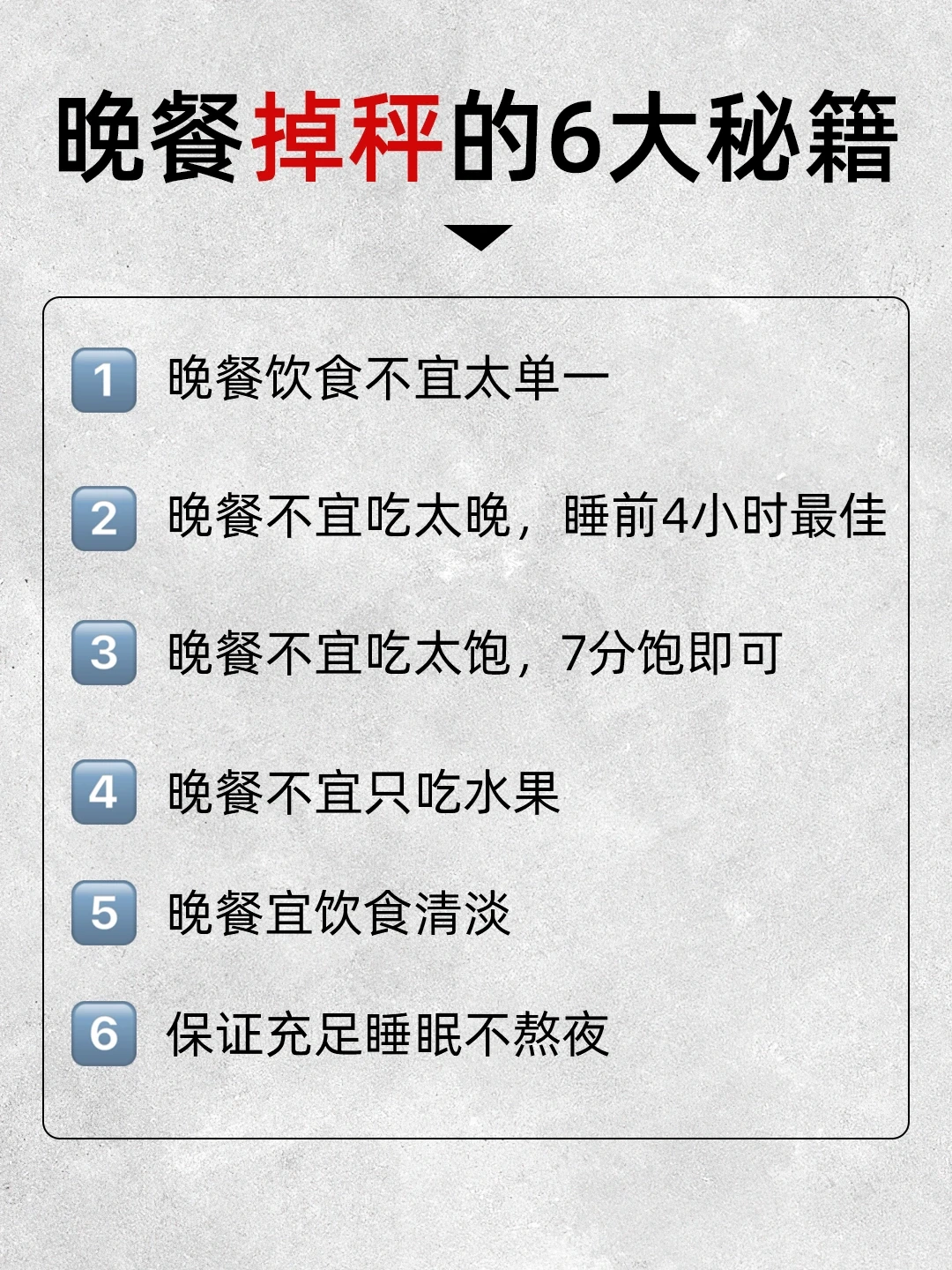 5️⃣千万不要不吃晚餐,不吃晚餐是特别伤害代谢的哦,短期来看,体重会下降,但是减掉的是肌肉和水分,并不是脂肪,恢复饮食后很容易反弹,甚至还是出现掉头发,所以晚餐一定要吃