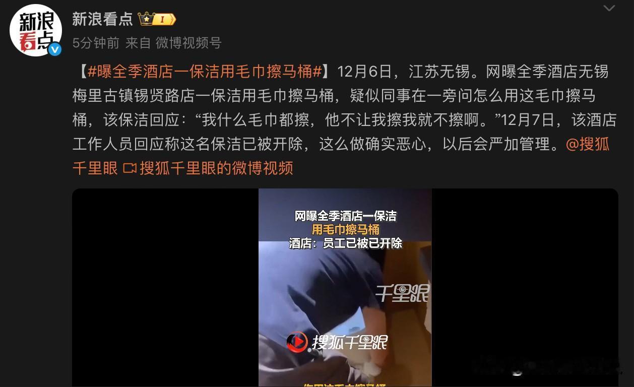 曝某知名酒店疑似用毛巾擦马桶,原来网传有可能是真的。以前经常出差住酒店,作为男性就徒个洒脱,并不喜欢自带毛巾和洗漱用品,基本上都是用酒店提供的。每次老婆都会提醒别用酒店的洗漱用品,说很多人在传很多酒店都喜欢用毛巾擦马桶。我从来没信过,以为人的底线不可能那么低,那是做人的基本良心,所以也就从来没听过老婆的。看了这则消息,目前我已经老实,以后还是老老实实自带洗漱清洁用品吧!冬日生活打卡季
