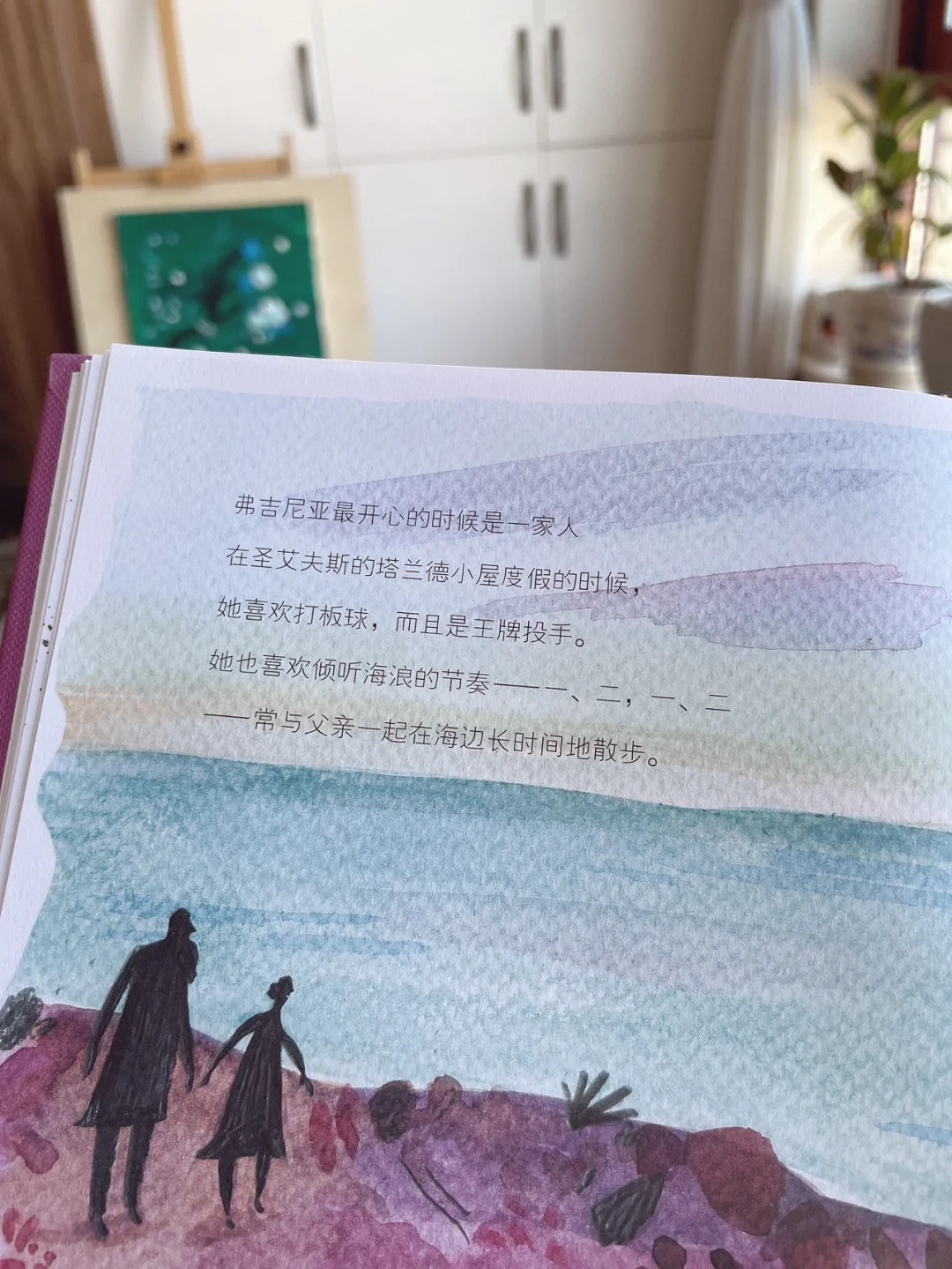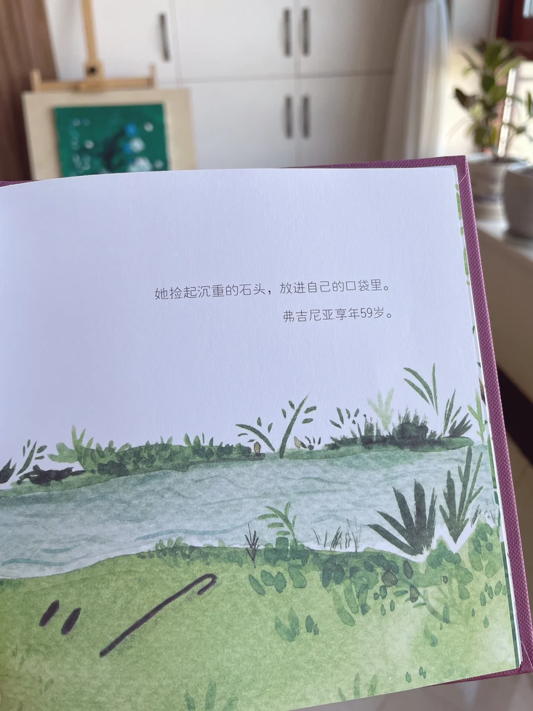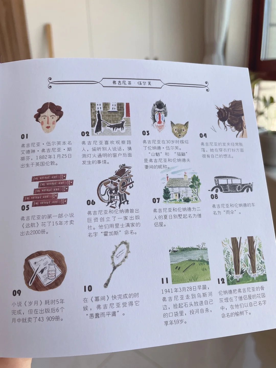 文字与插画结合的绘本风,十几分钟了解一位名人故事,自小身体柔弱的弗吉尼亚,精神分裂曾多次发作从未上学在家跟着父亲读书,当时许多学者名流是她家的常客,富裕的家境、父亲的博学、家藏书籍的丰富以及学者名流的影响熏陶,使她具有丰富的精神世界和细腻敏感的性格,精神分裂恶化期间仍酝酿新作,但写完时常对作品感到不满意,情绪困惑消沉,“二战”战火燃烧到英国,确信精神分裂即将复发,留下一纸绝命书感谢丈夫多年对她的关怀和照顾,随后投河自尽,看完有一种伤感但又释然的感觉