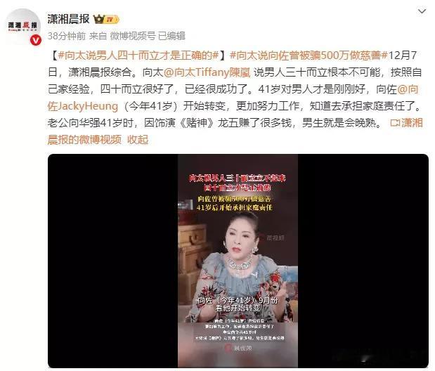 向太说男人四十而立才正确,男生就是晚熟。她拿儿子向佐举例,说向佐早年间做事不稳重,干啥都难成功,到41岁才被向华强认可,开始更努力工作,懂得承担家庭责任。她老公向华强也是41岁时,因演《赌神》龙五赚了大钱。 男人过早成功,可能因年少轻狂守不住事业。四十岁经历了挫折,思想成熟了,才更懂得打拼的艰辛,能守得住基业。向佐