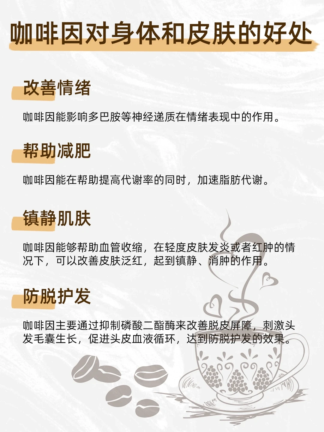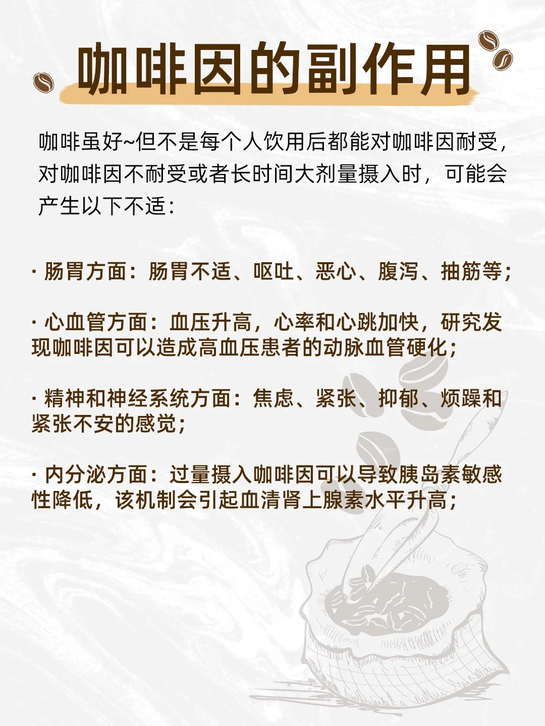 ⚠️内分泌方面:过量摄入咖啡因容易导致胰岛素敏感性降低,该机制可能会引起血清肾上腺素水平升高;