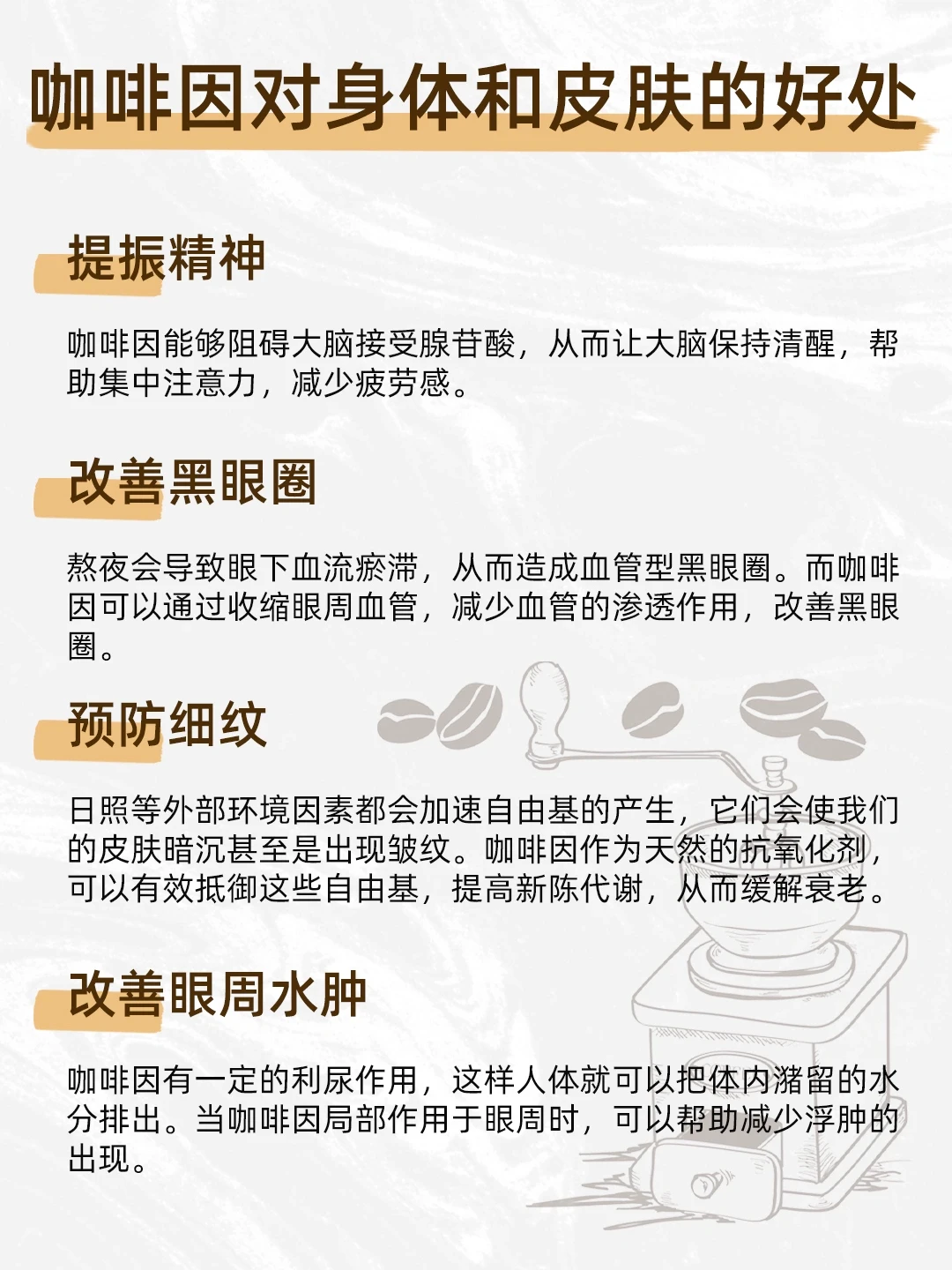 咖啡因有一定的利尿作用,这样人体就可以把体内潴留的水分排出。当咖啡因局部作用于眼周时,可以帮助减少浮肿的出现。