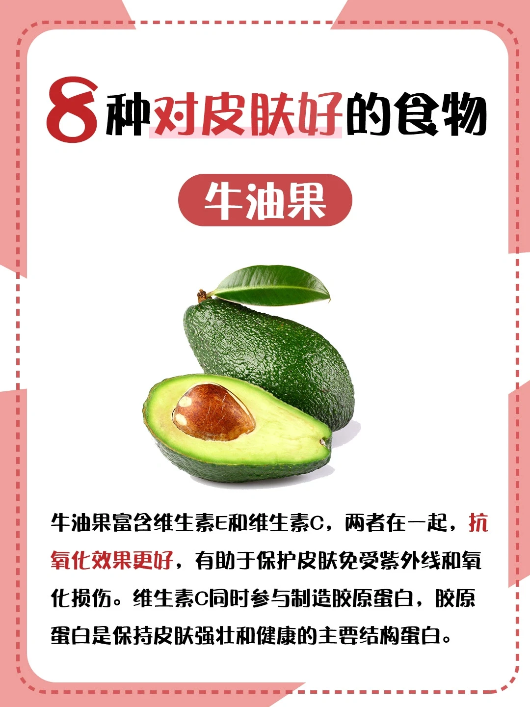 牛油果富含维生素E和维生素C,两者在一起,抗氧化效果更好,有助于保护皮肤免受紫外线和氧化损伤。维生素C同时参与制造胶原蛋白,胶原蛋白是保持皮肤强壮和健康的主要结构蛋白。