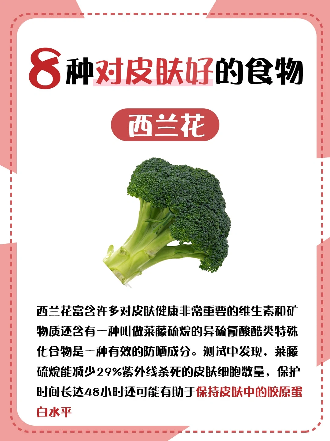 西兰花富含许多对皮肤健康非常重要的维生素和矿物质。还含有一种叫做莱菔硫烷的异硫氰酸酯类特殊化合物,是一种有效的防晒成分。