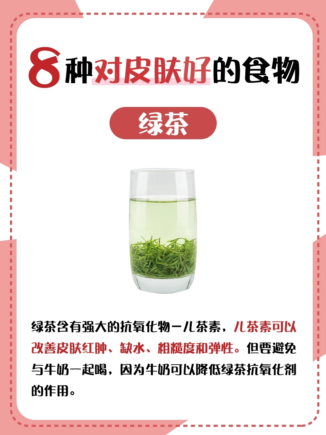 绿茶含有强大的抗氧化物-儿茶素,儿茶素可以改善皮肤红肿、缺水、粗糙度和弹性。但要避免与牛奶一起喝,因为牛奶可以降低绿茶抗氧化剂的作用。