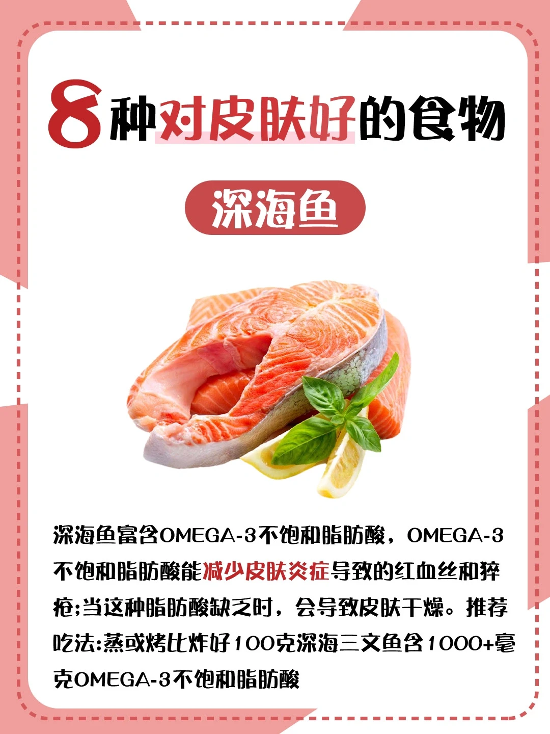 深海鱼富含Omega-3不饱和脂肪酸,Omega-3不饱和脂肪酸能减少皮肤炎症导致的红血丝和痤疮;当这种脂肪酸缺乏时,会导致皮肤干燥。
