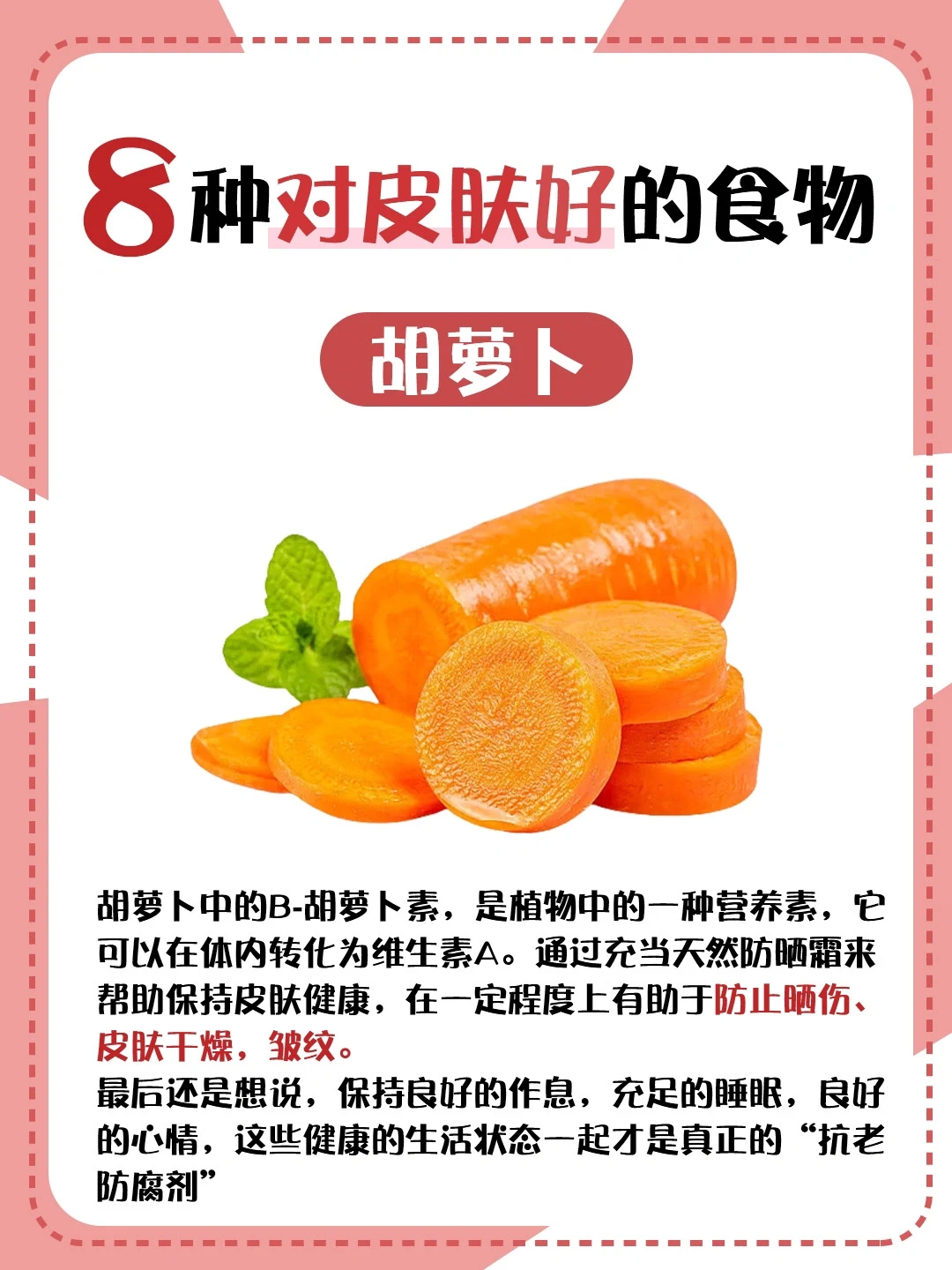 胡萝卜中的β-胡萝卜素,是植物中的一种营养素,它可以在体内转化为维生素A。通过充当天然防晒霜来帮助保持皮肤健康,在一定程度上有助于防止晒伤、皮肤干燥,皱纹。