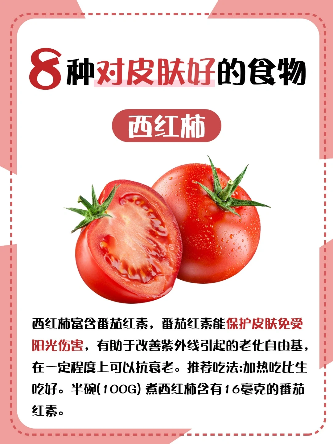 西红柿富含番茄红素,番茄红素能保护皮肤免受阳光伤害,有助于改善紫外线引起的老化自^由基,在一定程度上可以抗衰老。