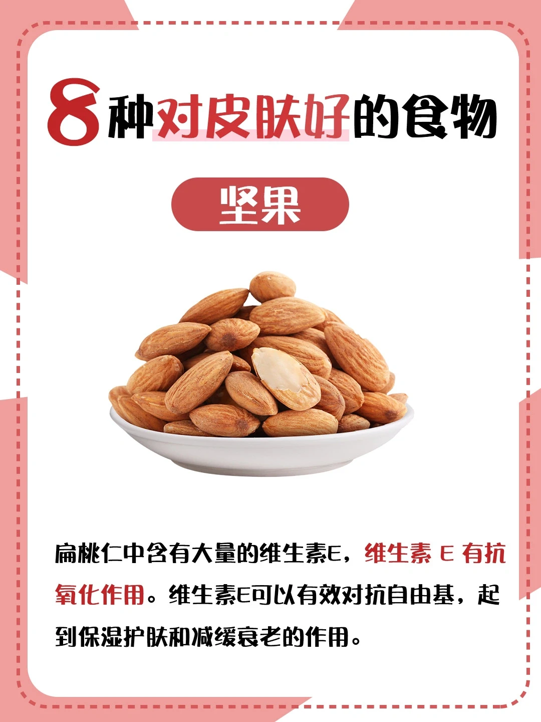 扁桃仁中含有大量的维生素E,维生素 E 有抗氧化作用。维生素E可以有效对抗自^由基,起到保湿护肤和减缓衰老的作用。