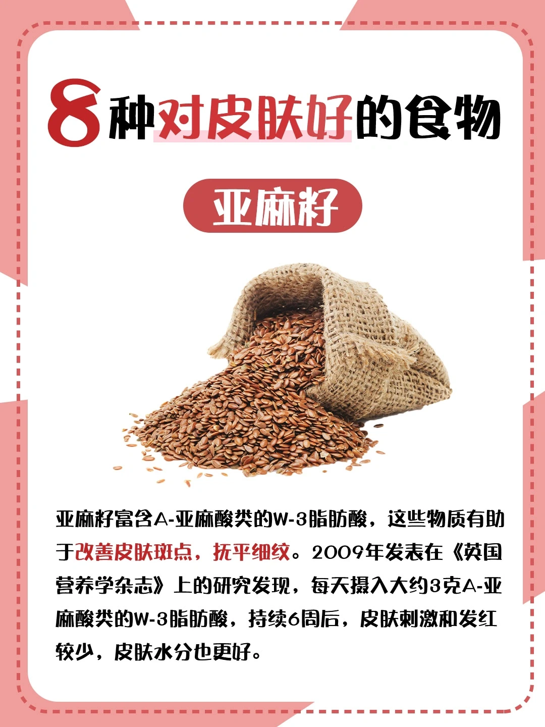 亚麻籽富含α-亚麻酸类的ω-3脂肪酸,这些物质有助于改善皮肤斑点,抚平细纹。