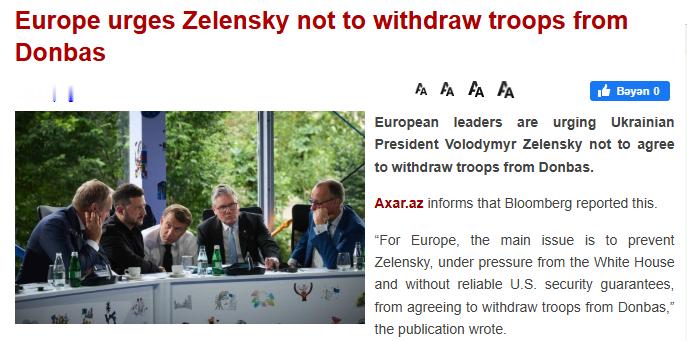 彭博社:欧洲领导人担忧美方施压,劝阻泽连斯基接受「撤出顿巴斯」方案彭博社日前报道