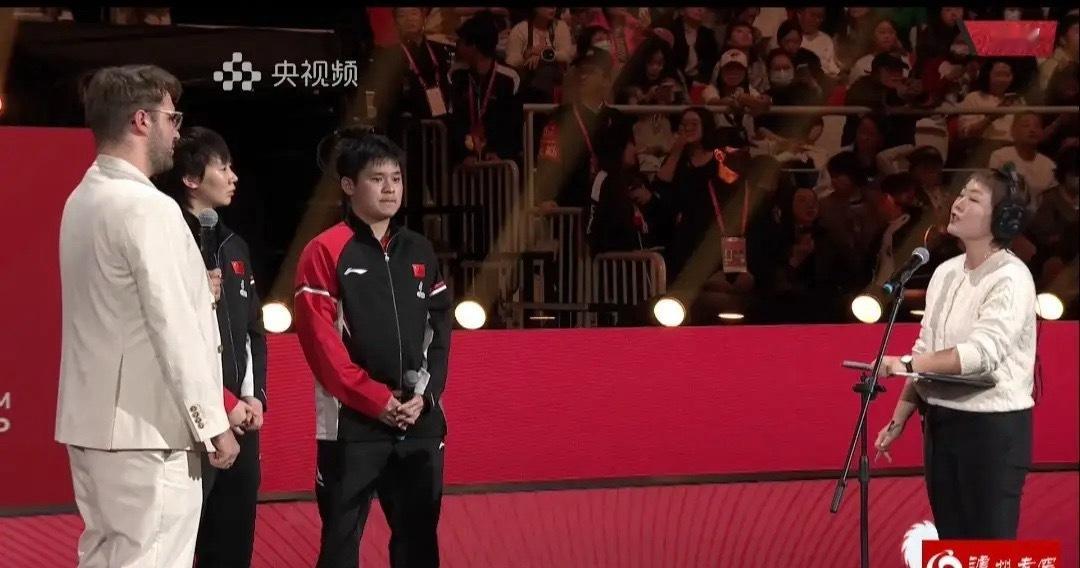 中国队获得冠军后,赛后采访,林诗栋特别激动,林诗栋说特别感谢教练组对我的信任让我上场,我也扛下了比赛,很高兴很兴奋,没有辜负教练组对我的期待,获得冠军是团队的努力的结果,这次比赛对我来说是一次难得的历练机会,有考验,有收获,感谢比赛,让我成长!我要继续加油,继续努力!中国队获得冠军后,采访王曼昱林诗栋,二人都非常激动,几乎都是哽咽着回答完记者采访!感人至深!
