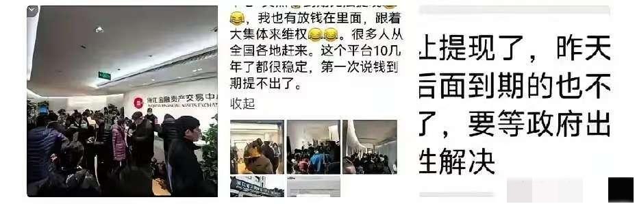 浙金中心不坑穷人, 产品暴雷炸出一堆有钱人, 被套的基本都是中产,50万验资门槛,几百万上千万的投资者欲哭无泪。 看着浙金中心大厅中一群来自全国各地讨要兑付的投资者,或许有人好奇,为什么会有这么多人前赴后继相信他们的理财? 首先浙金中心是一个理财老平台了,已经上线了十几年,安全问题大众都比较放心。再者他的理财收益点数是4%~5%每年,比不少银行的定期存款利率都高,这自然吸引了不少用户。 以往浙金中心都是非常火爆的,手速慢点的话还抢不到他们上线的理财产品,况且最重要的是一直都可以正常兑付,直到上个月28号暴雷的前几天,还有投资者刚刚提现,当时谁都不知道竟然平台说不行就不行了。 其实在去年的时候浙金中心就被取消了金融资产交易业务资质,但是这个消息却一直没有告知投资者。 如今暴雷的无数投资者都在暗暗叫苦,不少人声称自己家投了几百万,上千万的也大有人在。