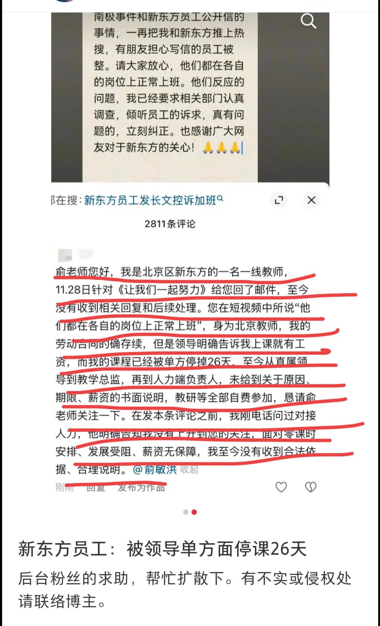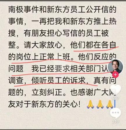 “南极”连续剧还在继续, 俞敏洪前几天又发文, 他说自己“南极”事件, 自己和公司一再被送上热搜。 虽然发文里面有点“祥林嫂”的味道, 但还是表态了, 员工不会被整, “他们都在各自的岗位上正常上班。 他们反应的问题, 我已经要求相关部门认调查, 倾听员工的诉求, 真有问题的, 立刻纠正。” 这个态度是很明确的, 我们也以为公司内部事情已经得到了解决。 事实真的如他所说吗? 未必吧。 在他的文案视频下面, 就有公司员工发出诉求。 他说自己是北京区新东方的一名一线教师, 11.28日针对《让我们一起努力》给老板回了邮件, 至今没有收到任何回复和后续处理。 老板在短视频中所说都已经回到岗位上班, 但是他作为北京校区的教师, 他的劳动合同的确存续。 领导明确告诉他不上课就没有工资, 而他的课已经被单方停掉26天, 至今没有任何领导出来对这件事给予说明。 现在连教研等全部自费参加, 所以他恳请老师关注, 在发本条评论之前, 他也打电话问过对接人力, 人力部明确告知, 底层员工没有上升到老板的关注, 面对零课时安排、 发展受阻、薪资无保障, 他请求公司给予一个明确的答复…… 这这这咋回事? 老板前脚出来声明, 员工立马质疑。 这次会不会又说是“外部力量”参与? 其实我也相信人力部的答复, 普通员工的确是达不到被老板的关注, 这句话我倒是赞同的, 老板不能啥事都要管, 他只能管大事情, 管下面的高层。 这是高层没能领悟到老板的意思, 还是高管们阳奉阴违? 这次老板会不会又出来说明? 散会! 新东方
