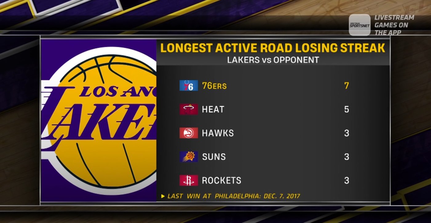 ▲湖人已经连续7次在客场对阵76人都没赢过