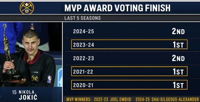 ▲最近5年的MVP投票情况,约基奇三年第一,两年第二